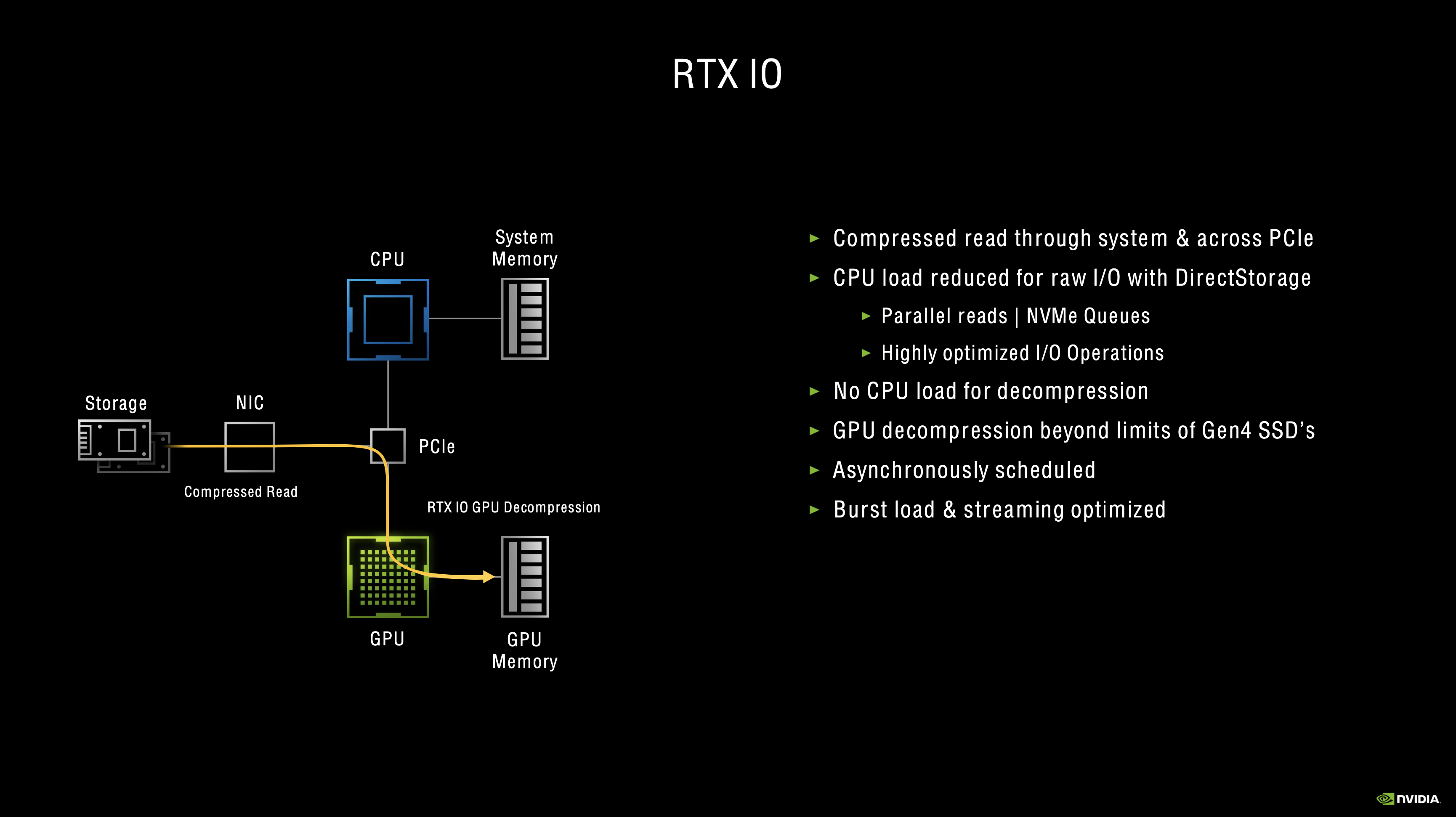 The solution is RTX IO. This is a new API that aims to deliver GPU-based lossless decompression, moving work from the CPU and to the GPU which, Nvidia claims, can provide ‘enough decompression horsepower to support even multiple Gen4 SSDs. This can enable I/O rates more than 100 times that of traditional hard drives, and reduce CPU utilisation by 20x.'