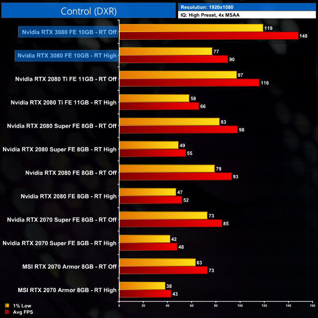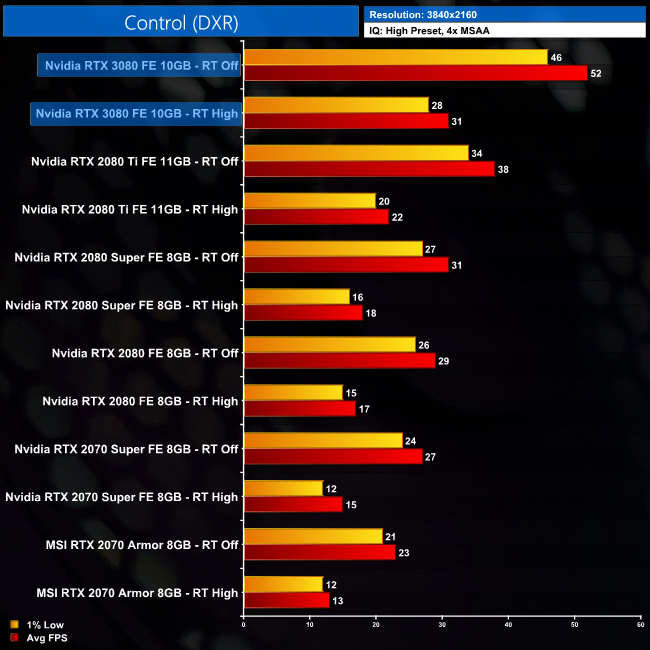 At 1440p, for instance, the RTX 3080 is 36% faster than the 2080 Ti when RT is turned on. With RT off, the 3080 is 32% faster. We can also see a marginally smaller performance hit when turning on the ray tracing effects – FPS drops by 40% for the RTX 3080, and 42% for the RTX 2080 Ti.
