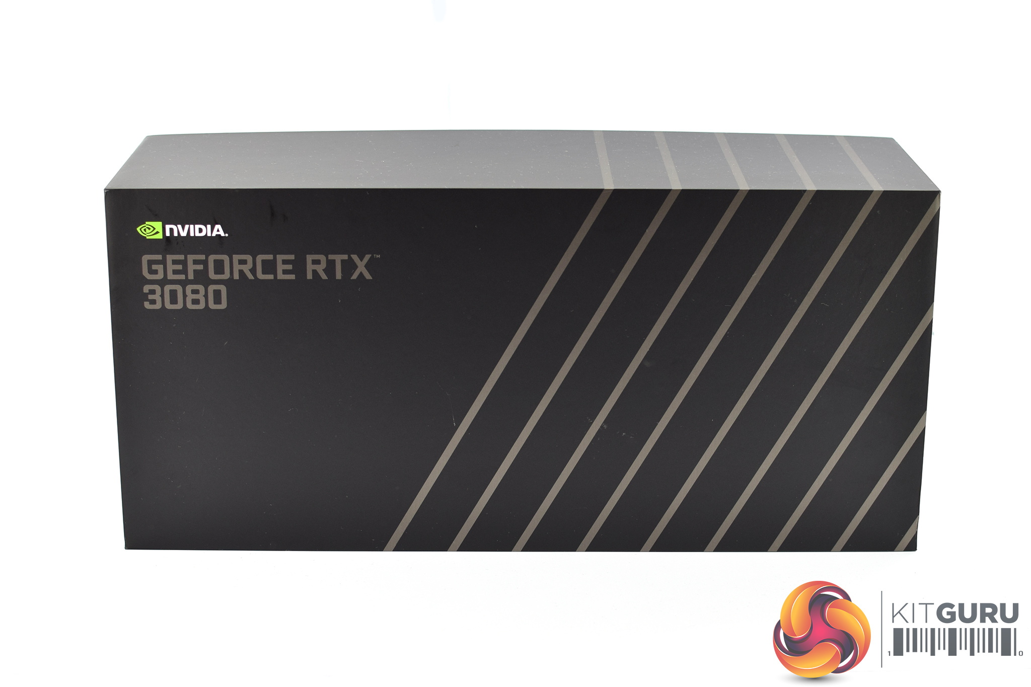 The RTX 3080 Founders Edition ships in a new style of box that is largely black, but with some silver accents. The Nvidia logo sits in the top left corner, just above the GeForce RTX branding.