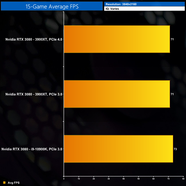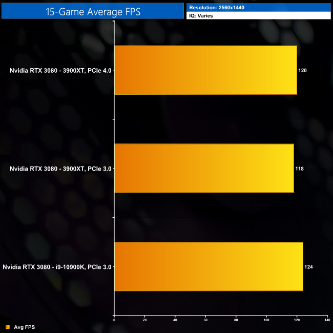 There's a couple of key points to make here. First of all, if you've gone through our game-by-game breakdown, you will not be surprised to see PCIe 4.0 makes very little overall difference compared to PCIe 3.0. Almost nothing, in fact – at 1440p, the average difference between the 3900XT with PCIe 4.0 and the same CPU with PCIe 3.0, is a mere 2%, or 2FPS. At 4K, the difference is reduced to exactly nothing.