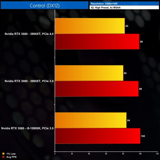 Our first game of the day is Control, and here we do see some difference at 1080p. The 3900XT PCIe 4.0 system outperforms its PCIe 3.0 equivalent by 3%, while it has a 1% lead over the Intel system too.