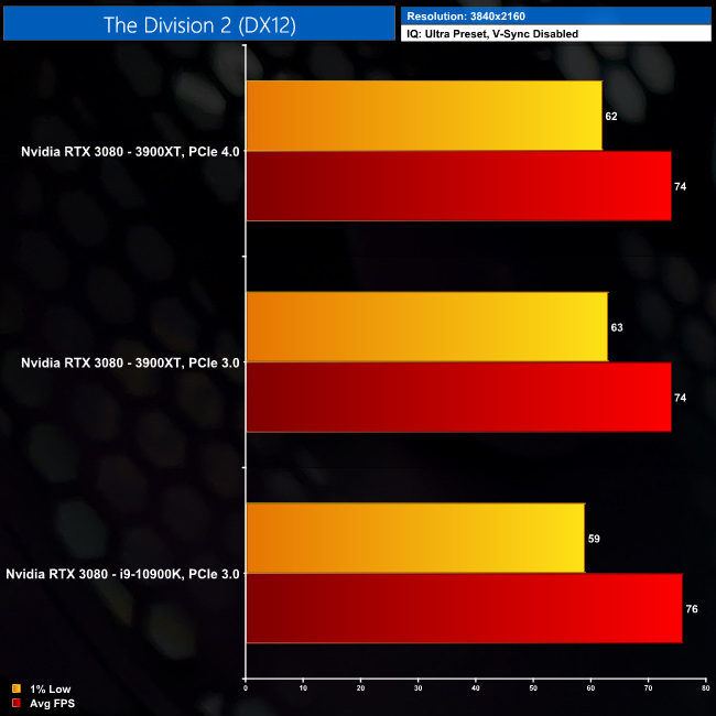 Next up is The Division 2. At 1080p, our Intel test system is 6% faster than the Ryzen 3900XT with PCIe 4.0. Moving to PCIe 3.0 on the AMD system does make a small difference though, but only 2%.