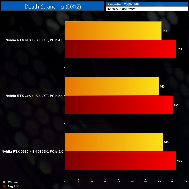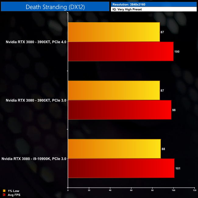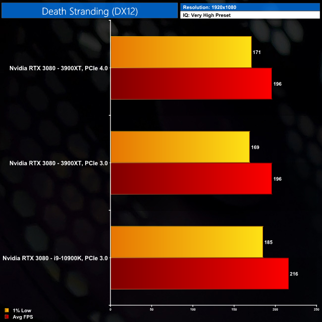 Moving onto Death Stranding, here we have a good example of Intel outperforming AMD for 1080p gaming, as our Intel system pulls 10% ahead of the 3900XT Gen4 test data.
