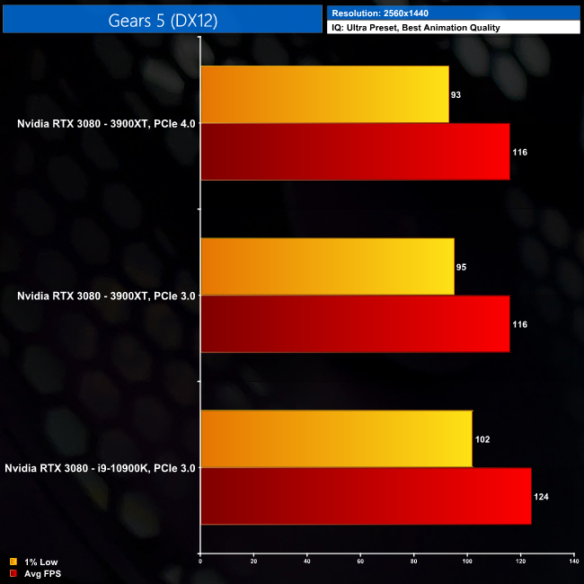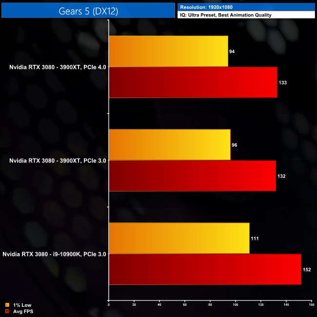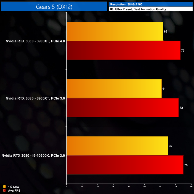 The performance trend in Gears 5 isn't that different to Far Cry. Here, Intel's gaming superiority at 1080p comes to the fore again, with our 10900K system outperforming the AMD systems by 14%. There is a single FPS difference between AMD with PCIe Gen4 vs with Gen3, too, but that'd be well within margin for error.