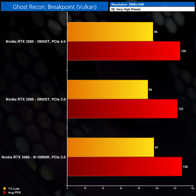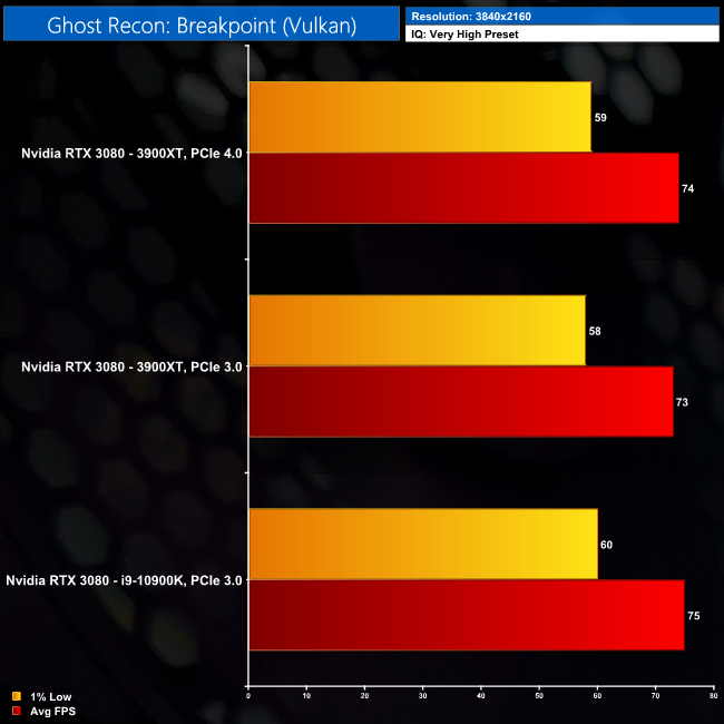 It's more of the same in Ghost Recon: Breakpoint, albeit on a slightly smaller scale. The Intel system outperforms AMD with PCIe Gen4 across every resolution we tested – there's certainly not much in it at 1440p and 4K, but the overall performance crown remains with Intel.