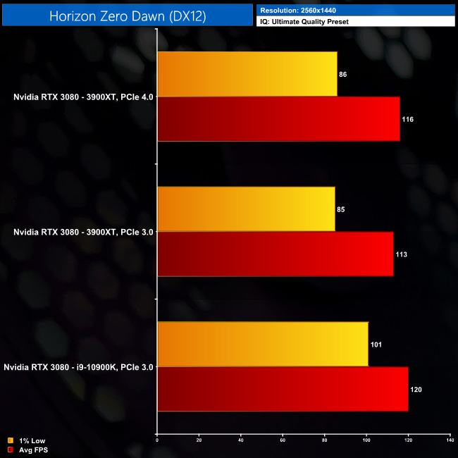 Horizon Zero Dawn is a game we introduced specifically for this testing, as we saw a number of reports suggesting the game benefitted significantly from increased PCIe bandwidth – at least when moving from PCIe 3.0 x8 to x16. We wanted to see if that carried over to PCIe Gen4 with the RTX 3080.