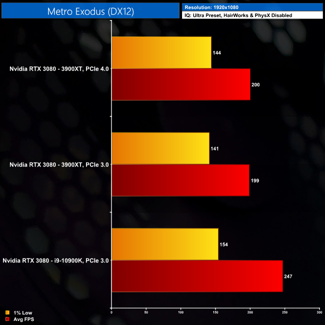 The performance trends within Metro Exodus don't really change when turning RT on. The game still prefers Intel hardware across the board, and Gen4 vs Gen3 with the 3900XT doesn't make any meaningful difference.