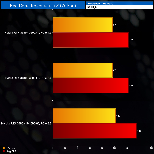 As for Red Dead Redemption 2, we're heavily CPU bottlenecked at 1080p, and in fact the performance numbers from our AMD system didn't change at all as we increased the resolution to 1440p. The Intel system was 7% faster at that resolution.