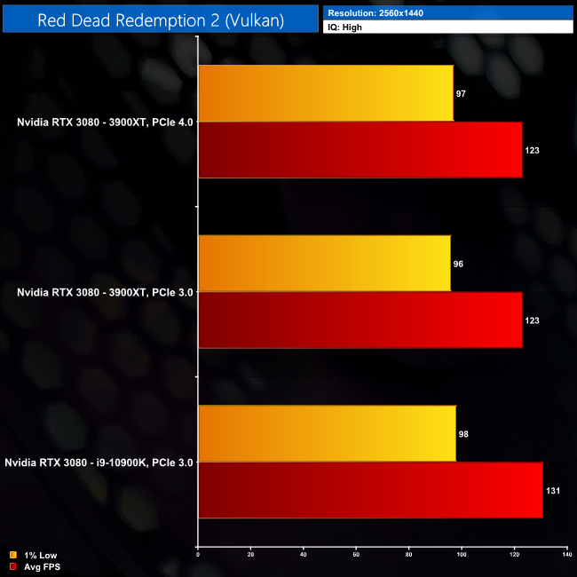 We can see AMD's system doing better with PCIe 4.0 than with PCIe 3.0, but only by a 2% margin at most, resulting in just an extra 3FPS at 1440p.