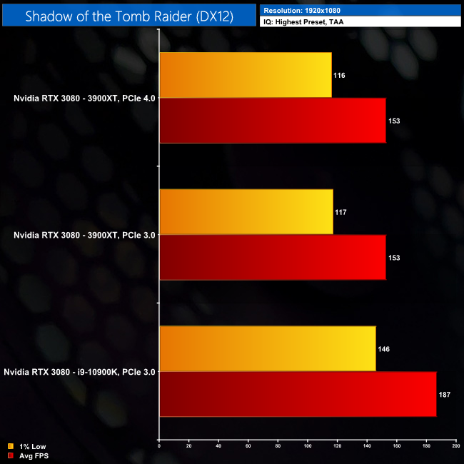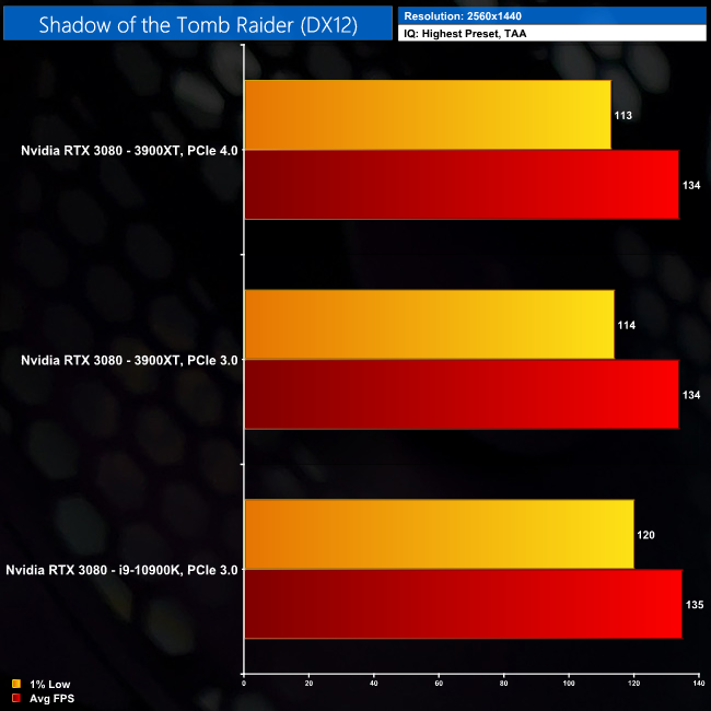 At 1080p in Shadow of the Tomb Raider, we do see some benefit to PCIe 4.0, as the 3900XT results with Gen4 are 3% higher than the same CPU running PCIe 3.0. However, that still only puts performance on par with our Intel system, which remains the case at 1440p and 4K resolutions.