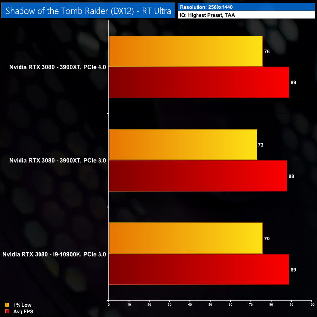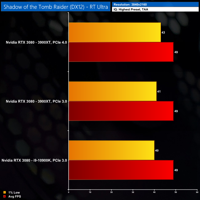 Apart from a strong performance lead in favour of Intel at 1080p, the results in Shadow of the Tomb Raider are pretty much identical at 1440p and 4K, so this is another game which doesn't seem to care about PCIe 4.0.