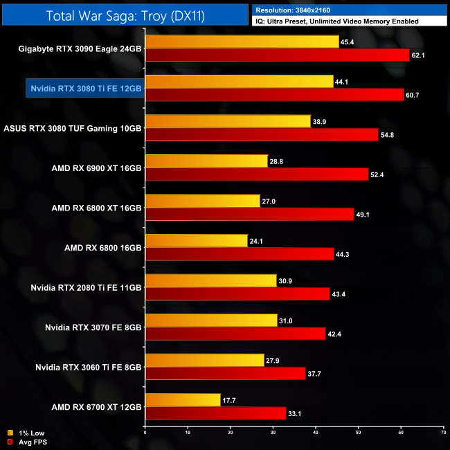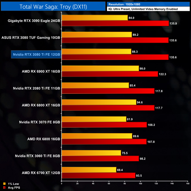 As for Total War Saga: Troy, we know this game favours Nvidia hardware, and that is clear to see with even the RTX 3080 beating the RX 6900 XT at 1440p. The RTX 3080 Ti is 10% faster than its non-Ti sibling, and just 1% slower than the RTX 3090. At 4K, that gap does widen to 2%, but clearly the RTX 3080 Ti is snapping right at the heels of the BFGPU.
