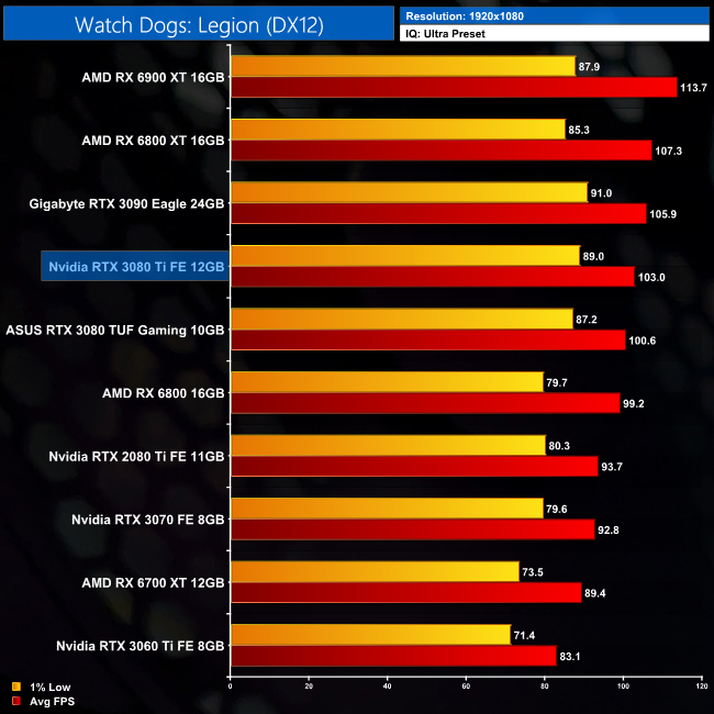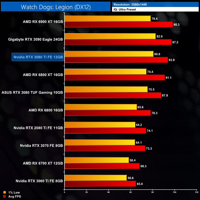 Finally, we close out our game testing with Watch Dogs: Legion. Interestingly enough, the RX 6900 XT is top dog at 1440p here, despite this being an Nvidia sponsored title, with the RTX 3080 Ti coming in 5% slower, while it's 3% behind the RTX 3090.