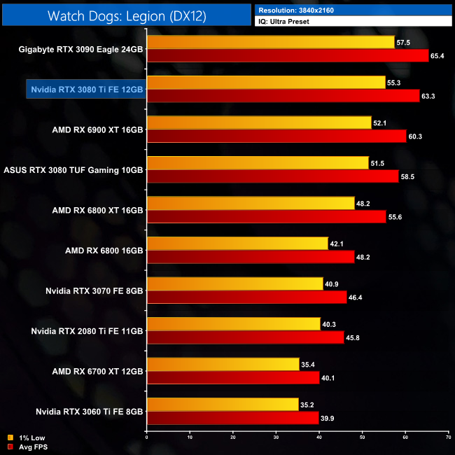 At 4K, the 3080 Ti does overtake the RX 6900 XT, leading it by a 5% margin, though that's only a difference of 3FPS. We're also still looking at a 3% difference between the RTX 3080 Ti and the RTX 3090, with just a couple of frames between those two GPUs.