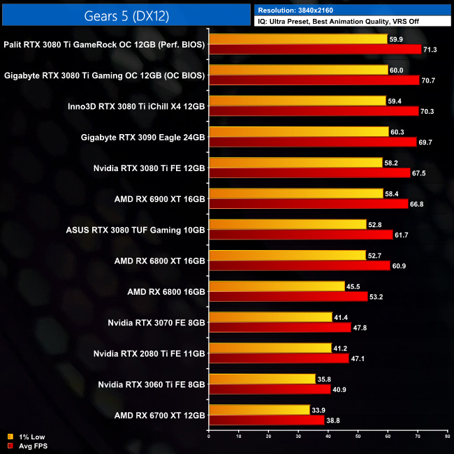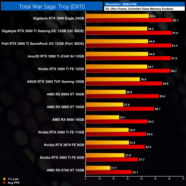 This data shows us there isn't a whole lot to be gained from a factory-overclocked AIB card. In some instances, the factory OC is enough to push the RTX 3080 Ti beyond the RTX 3090, as seen in Gears 5. In other examples however, such as Total War Saga: Troy, the added clock speed the partners have added really is inconsequential. The bottom line is an RTX 3080 Ti performs like an RTX 3080 Ti, and factory overclock or not, they are all very much in the same ballpark.