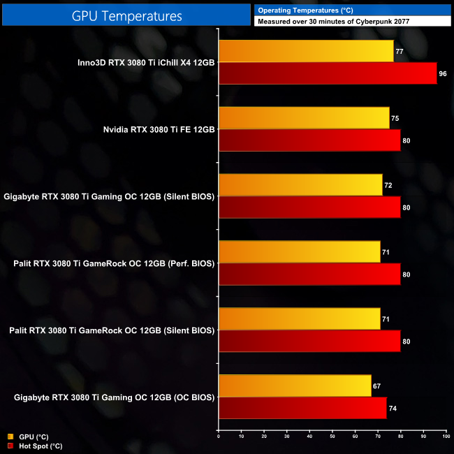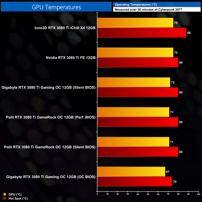 Temperature testing is where we can see more of a difference between the four cards tested. First of all, Nvidia's decision to use the RTX 3080 cooler for the RTX 3080 Ti is not problematic at all, as the GPU hot spot did not exceed 80C in our testing. The Palit and Gigabyte cards are able to better this, with the Gaming OC's OC BIOS delivering the coolest results, with a hot spot temperature of 74C.
