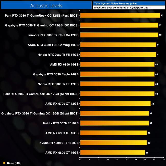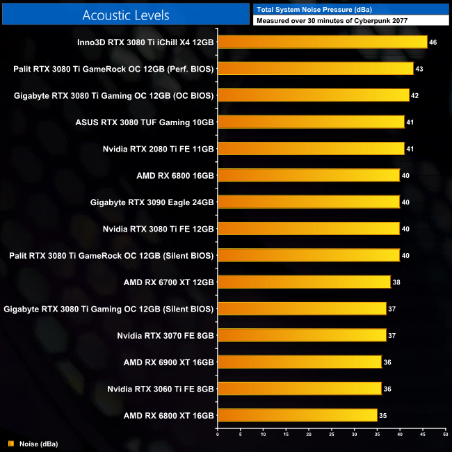 In terms of noise levels, there is again a good amount of variation between the cards tested. Top of the pile is the iChill X4 which produced 46dBa of noise with its fans spinning up to 59%, or 2150RPM. The Palit and Gigabyte models are next when using their OC, or Performance BIOS, as these modes do run a higher power limit than the Silent BIOS modes.