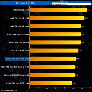 Using the graphics card-only power draw figures presented earlier in the review, here we present performance per Watt on a per-game basis for all twelve games we tested at 1440p.