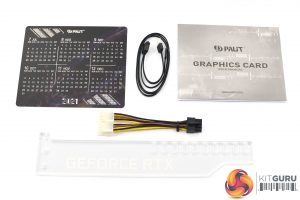 Inside we find a couple of documents, one ARGB cable, one 2x 6-pin to 1x 8-pin power adapter, as well as a plastic support bracket which can be used to help support the graphics card once it's installed.