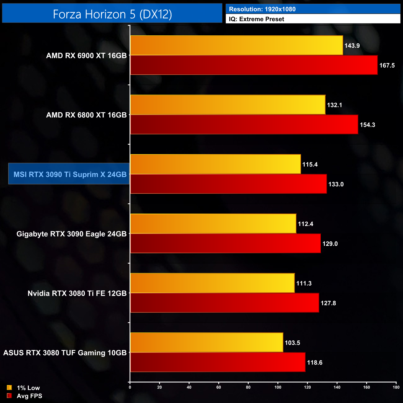 Next up is Forza Horizon 5 and the results here are particularly interesting. For starters, Nvidia GPUs get an absolute kicking by their AMD counterparts in this title, with the RTX 3090 Ti 9% slower than even the RX 6800 XT at 1440p, making it 16% slower than the RX 6900 XT.