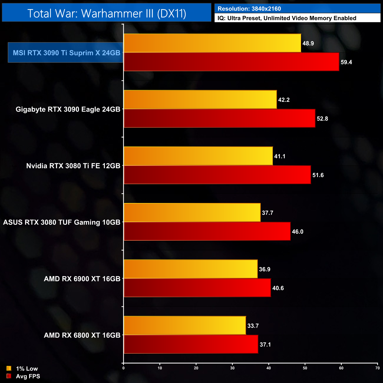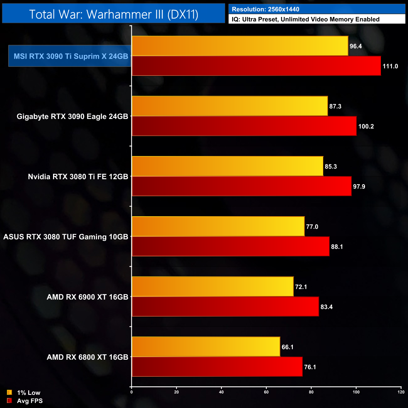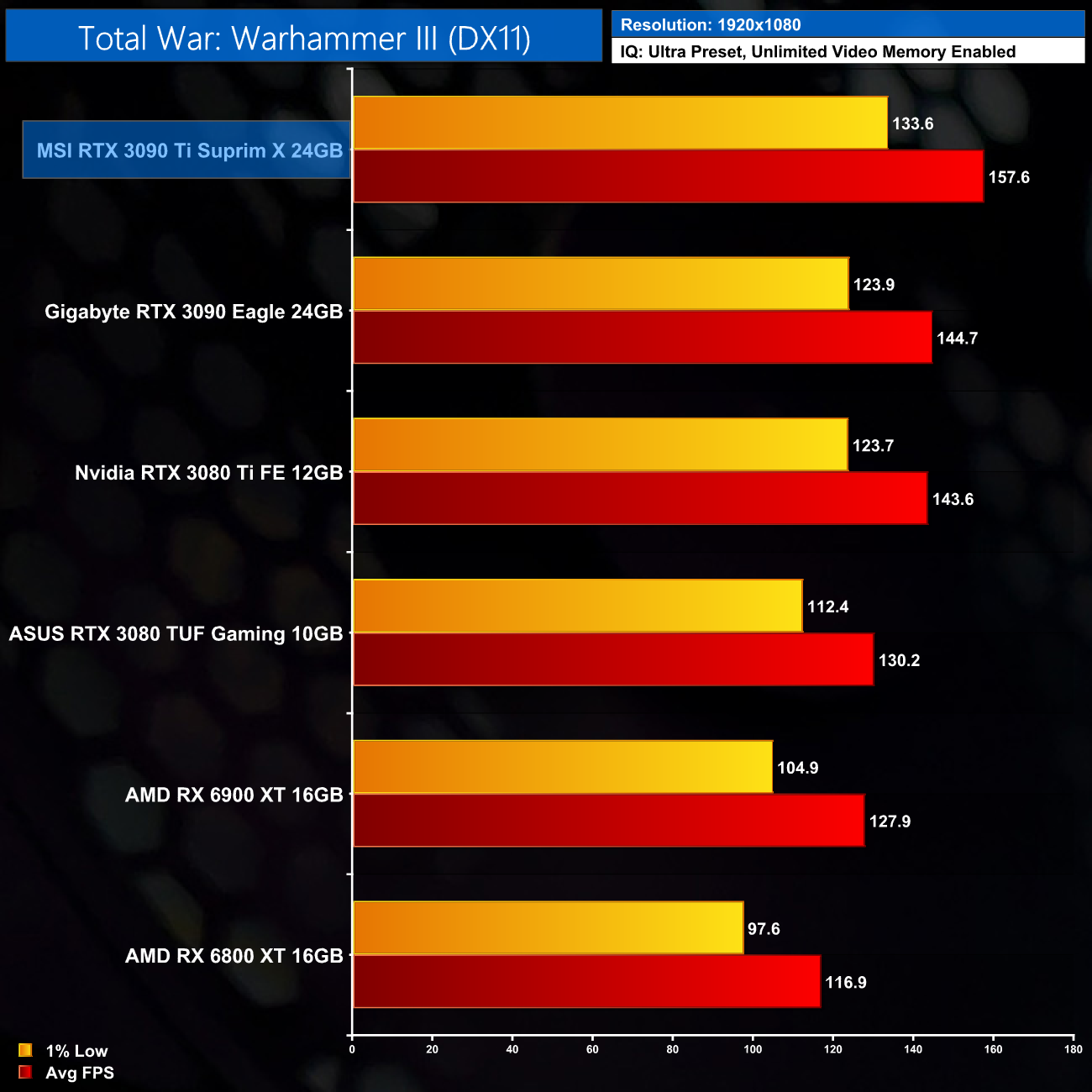 Lastly, we finish with Total War: Warhammer III. AMD GPUs definitely struggle in this title, and at 1440p we can see the RTX 3090 Ti is 33% faster than the RX 6900 XT, though compared to the RTX 3090 non-Ti, we're looking at a difference of 11%.