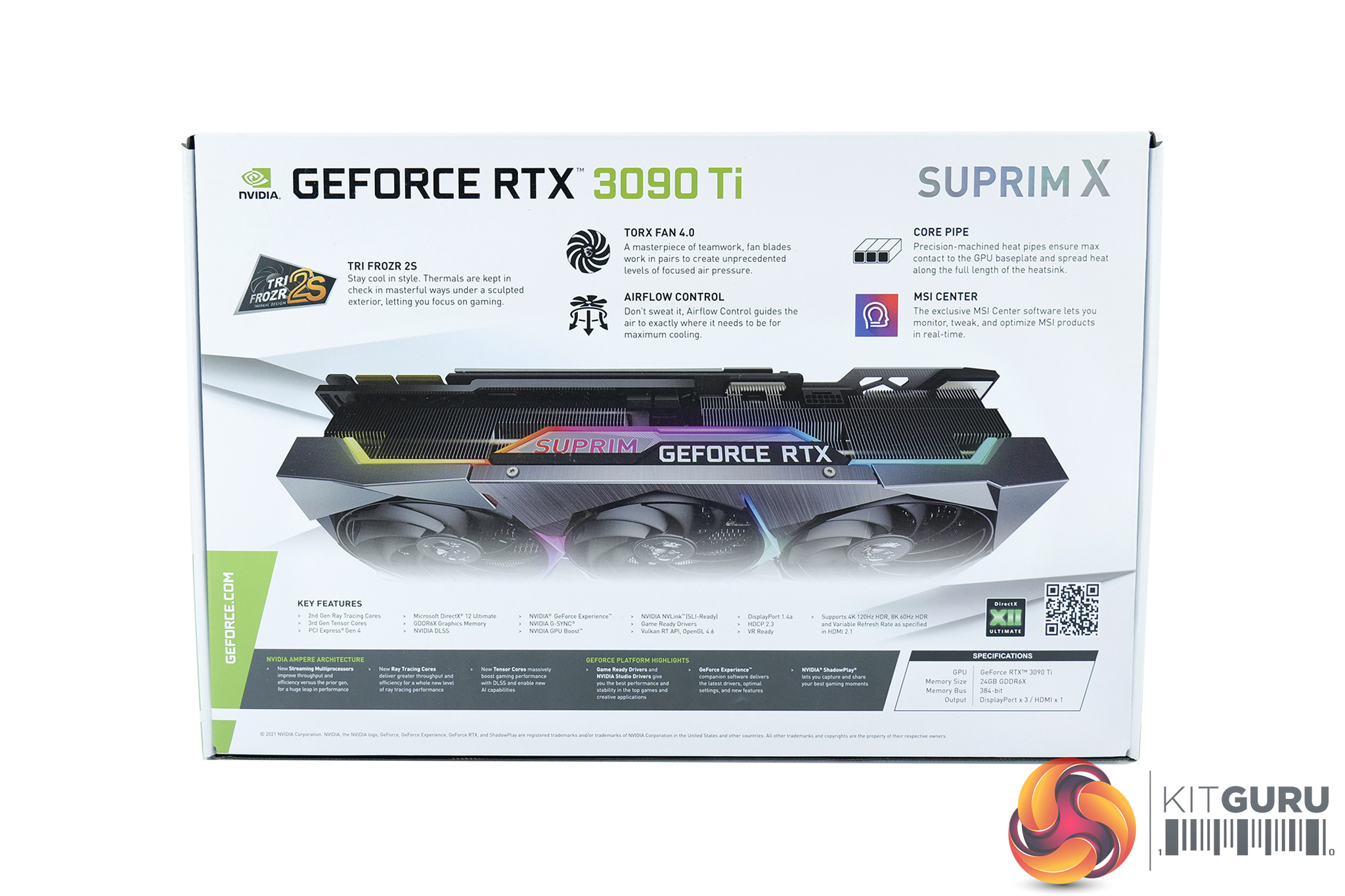 The MSI RTX 3090 Ti Suprim X ships in a large white point, with an image of the graphics card dominating the front. On the back, MSI highlights various key features of the card, its cooler and design.