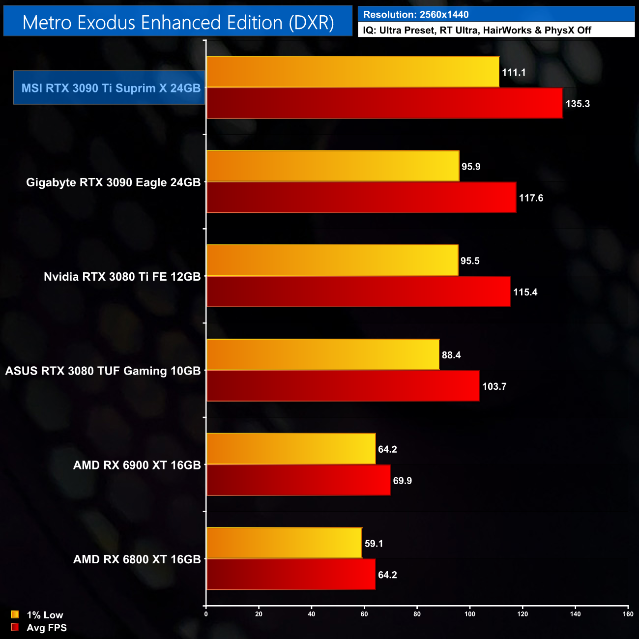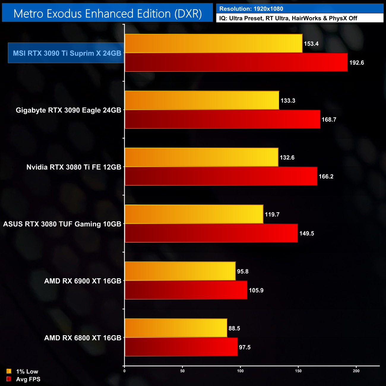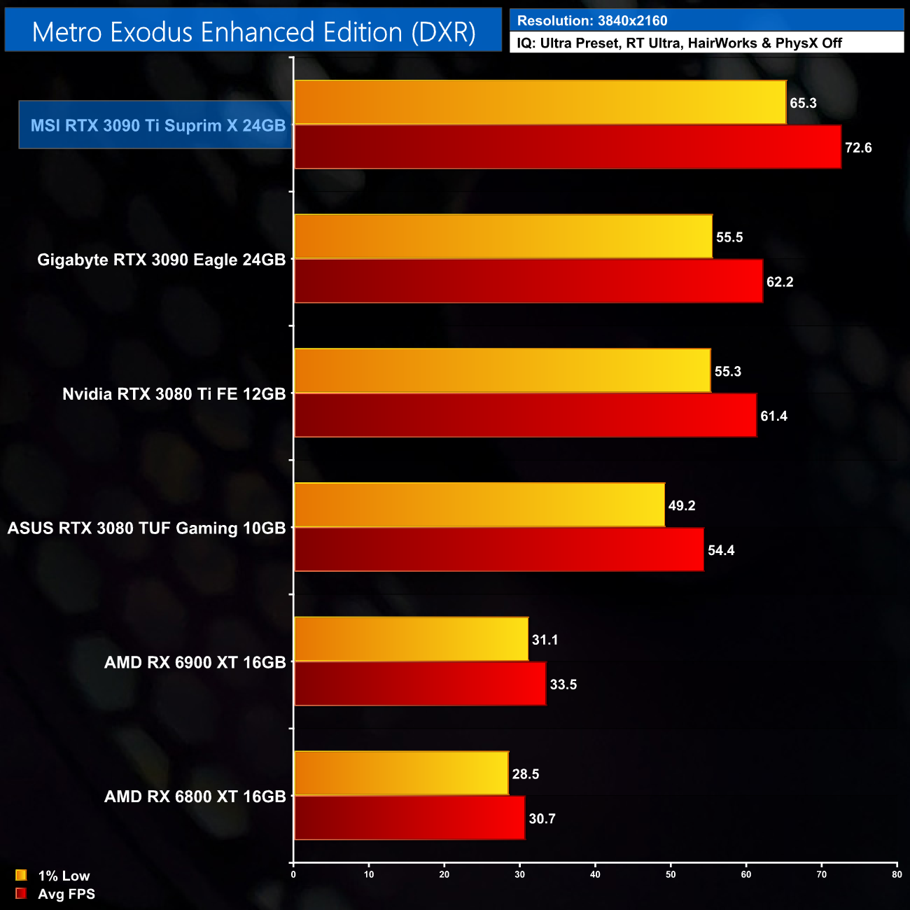 Metro Exodus Enhanced Edition is arguably the best showcase for ray tracing in games, with excellent performance despite a vast amount of ray tracing on show. At 4K, the RTX 3090 Ti averages over 70FPs, delivering s 17% uplift compared to the RTX 3090. It can also deliver over twice the performance of the RX 6900 XT.