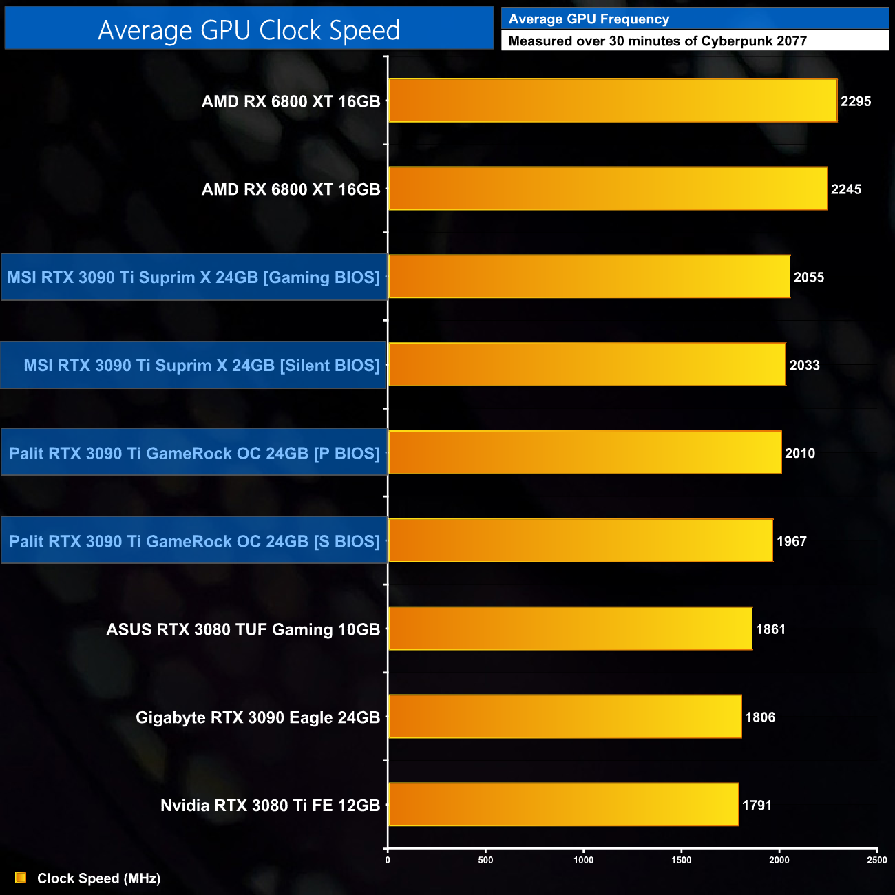 The reason we see such similar performance between both RTX 3090 Tis that we have tested is due to the operating clock speed. MSI's Suprim X is the fastest, but only by around 45MHz in the real world, which is enough to affect gaming performance by 1-2%, but it's really not something you'd notice when actually gaming.