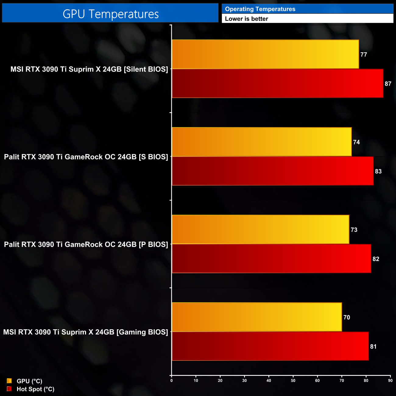 As for thermals, we have tested both BIOS modes on each card here, and to be honest there's not much difference between even the best and worst results. The Suprim X does run coolest out of the box when using the Gaming BIOS, with a GPU hotspot of 81C, but at worst using the Silent BIOS, the hotspot only hit 87C. Palit's results are right in the middle, with just a 1C difference between its Performance and Silent BIOS.