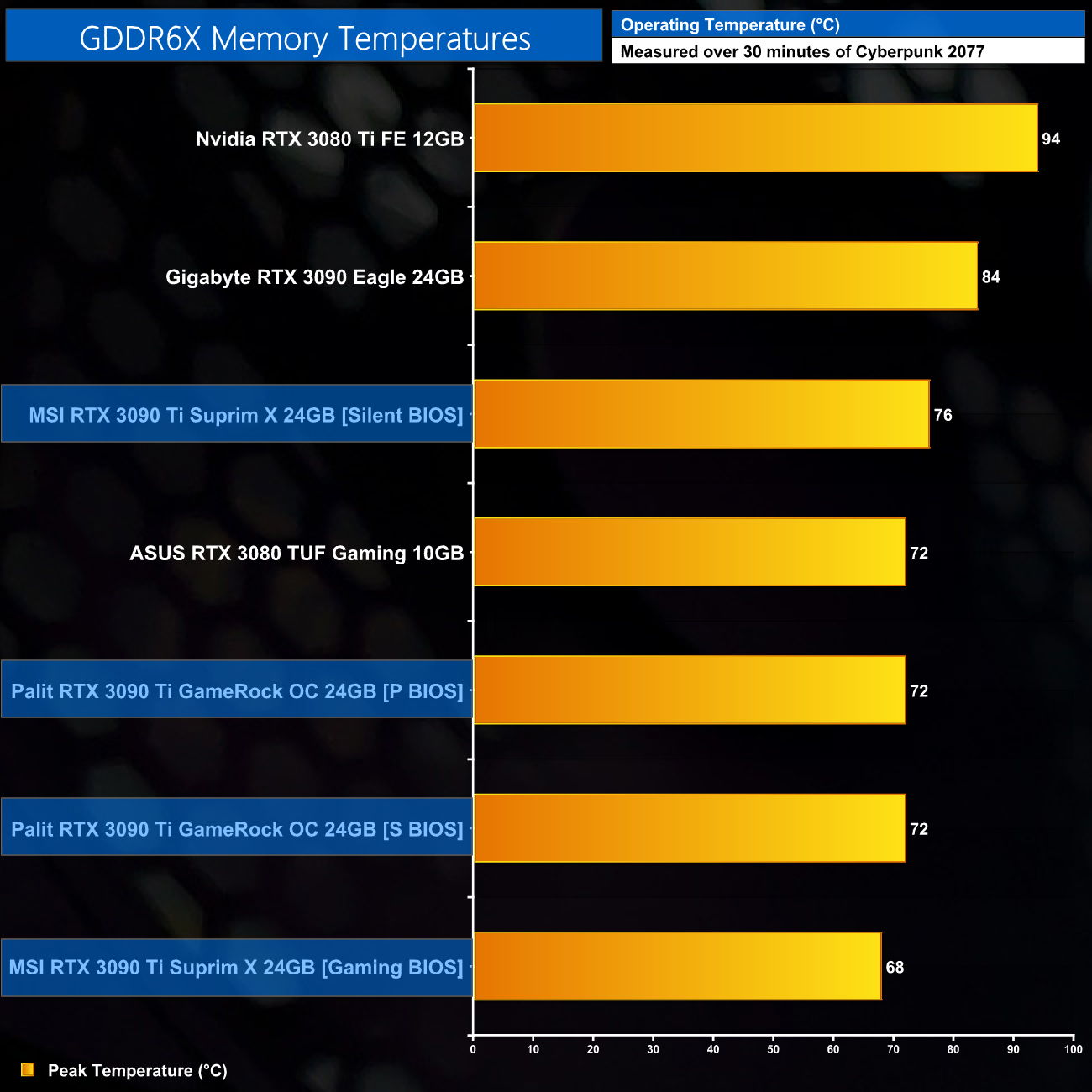 For our temperature testing, we measure the peak memory temperature under load. A reading under load comes from running Cyberpunk 2077 for 30 minutes.