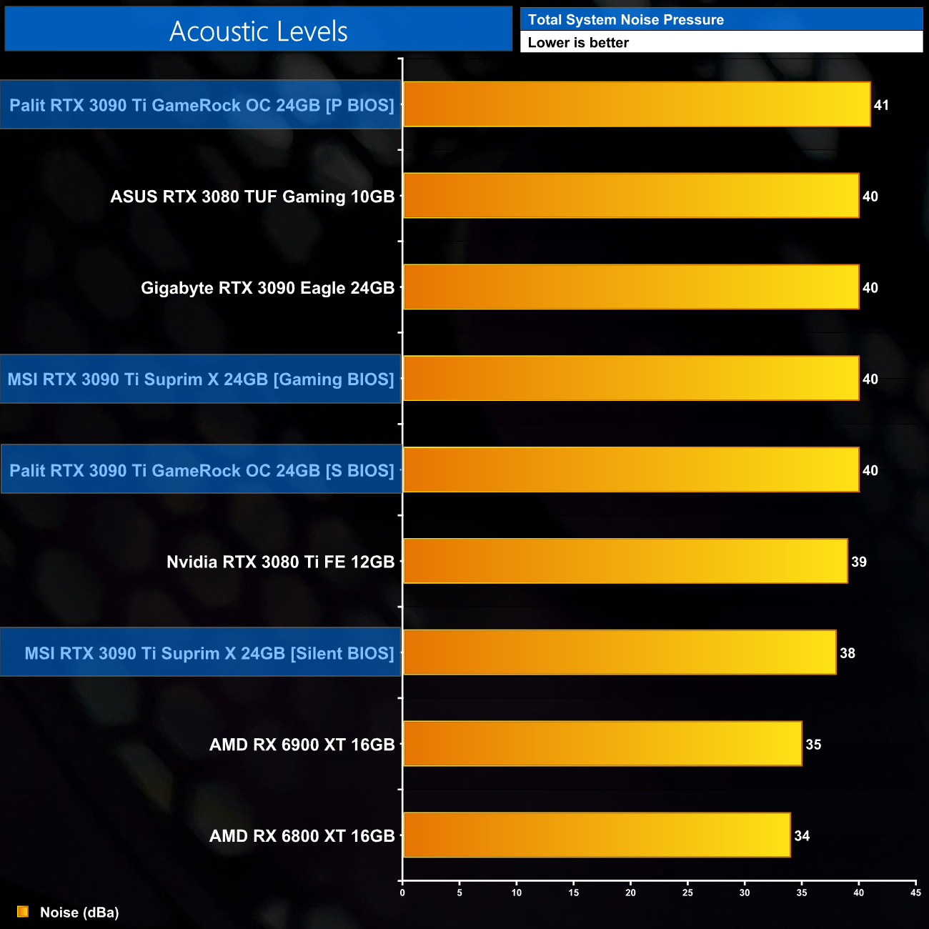 As for noise levels, one consequence of the 3090 Ti being such a high power GPU is that all of the cards we tested were audible under load. Some were quieter than other, with MSI's Silent BIOS delivering the lowest noise levels, but at 38dBa it was still audible to my ear. It's still not loud of course, but you may just have to adjust your expectations – to cool over 450W of power is going to require higher fan speeds than if this were just a 350W GPU, for instance.