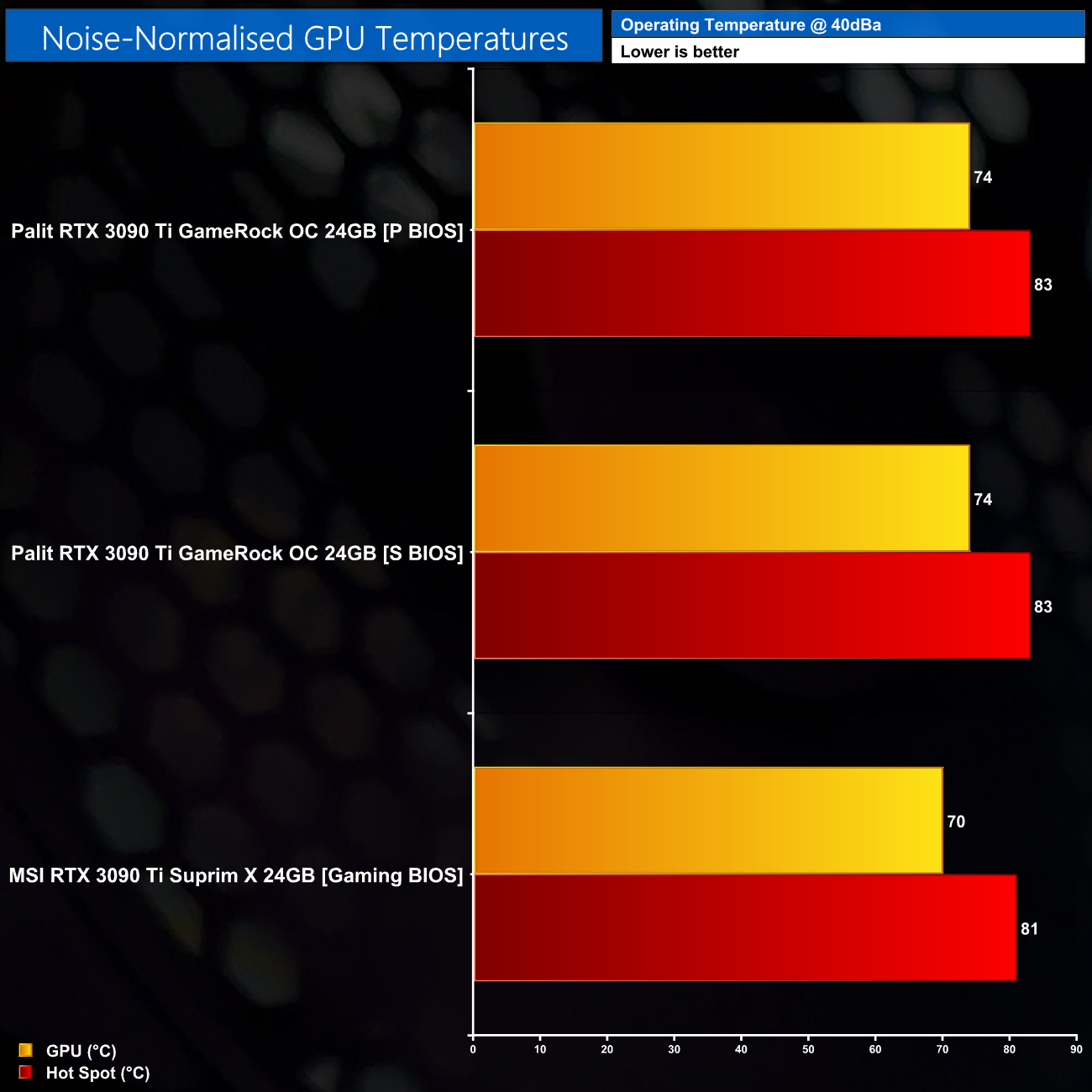 Removing noise levels from the equation, we also look at noise-normalised temperatures, with fan speeds set to output 40dBa. The MSI Suprim X ran coolest here, but only by 2C when looking at the GPU hotspot temperature. We also tested both BIOS for the Palit GameRock, as the P BIOS does have a 10W higher power target, but even that didn't make a difference to thermals once we had set the same fan speed for both BIOS.