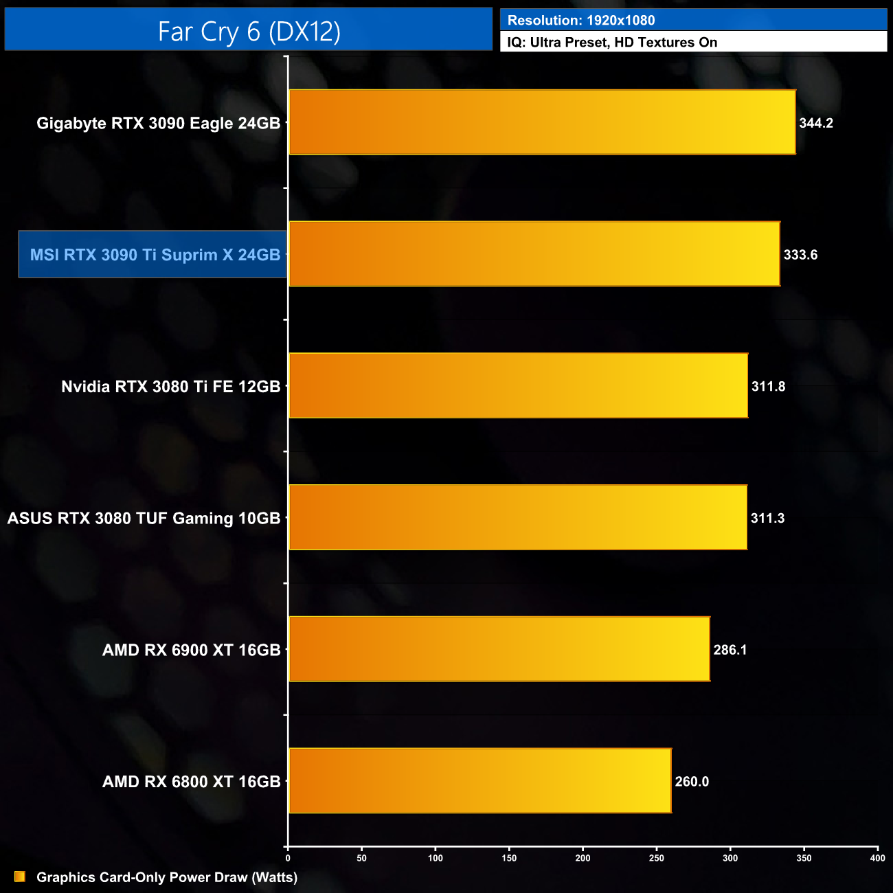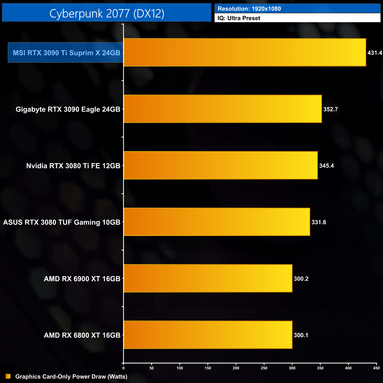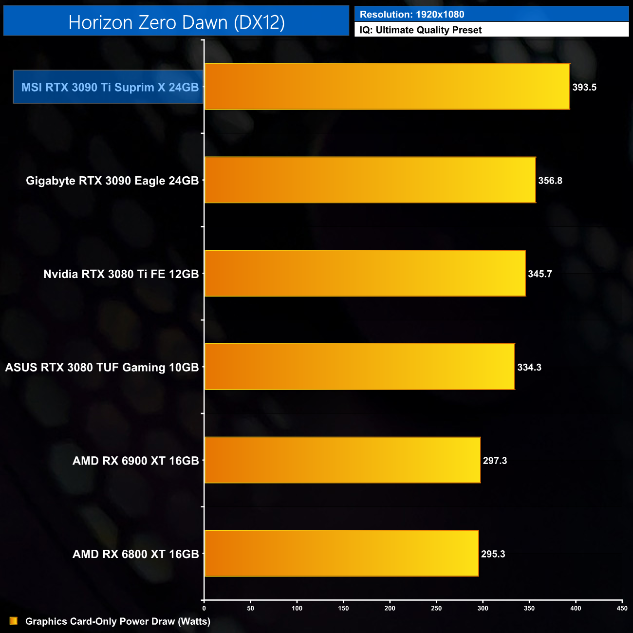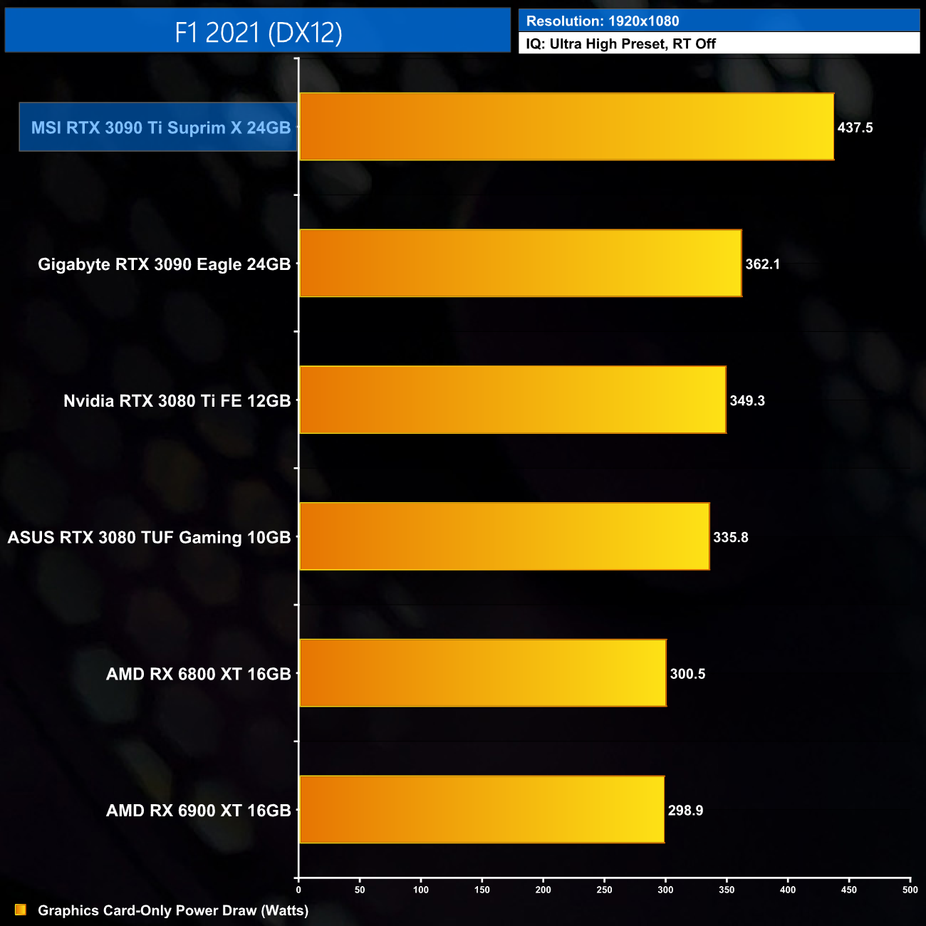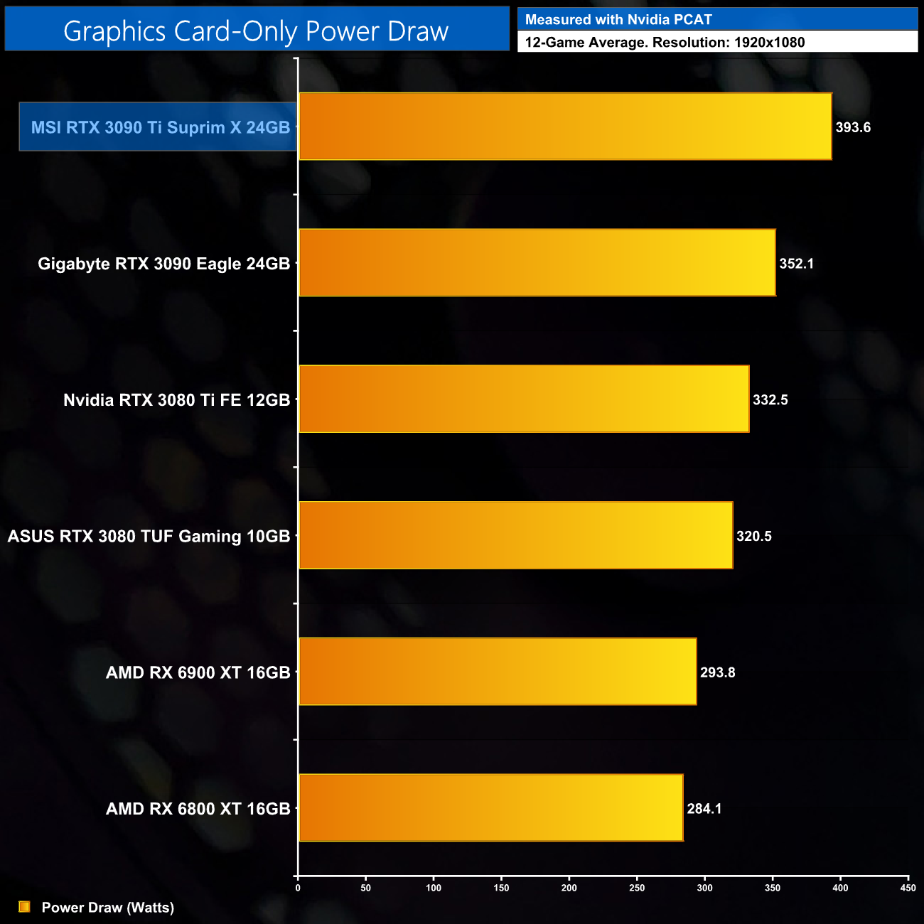 Despite the Suprim X's 480W power target, average power draw is lower at 1080p, where the GPU isn't always fully utilised – we saw an average figure of 394W, a 40W increase over the RTX 3090.