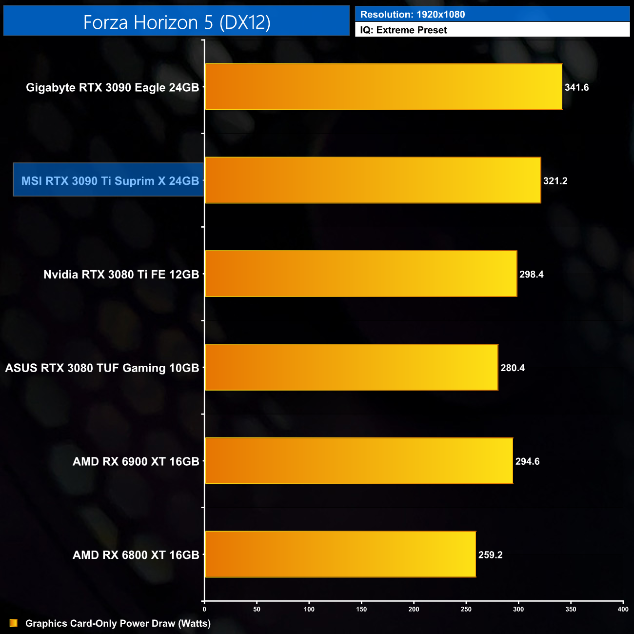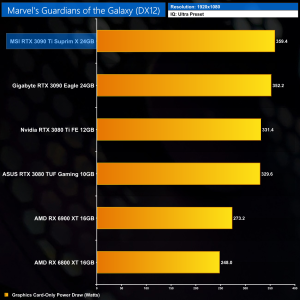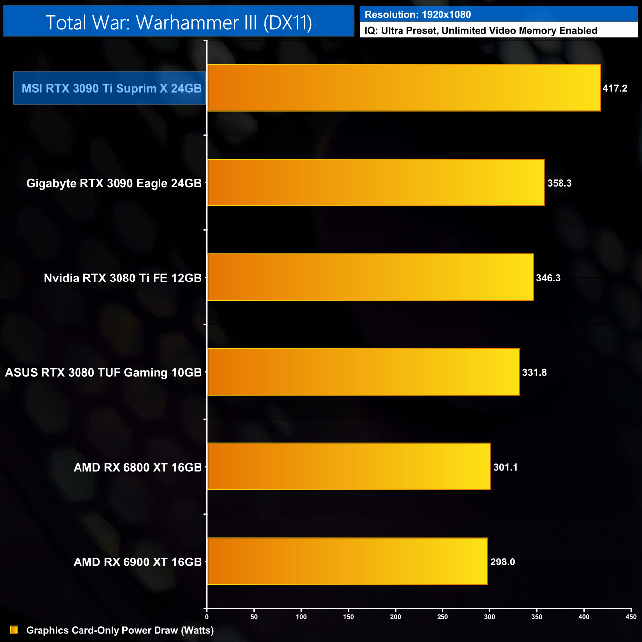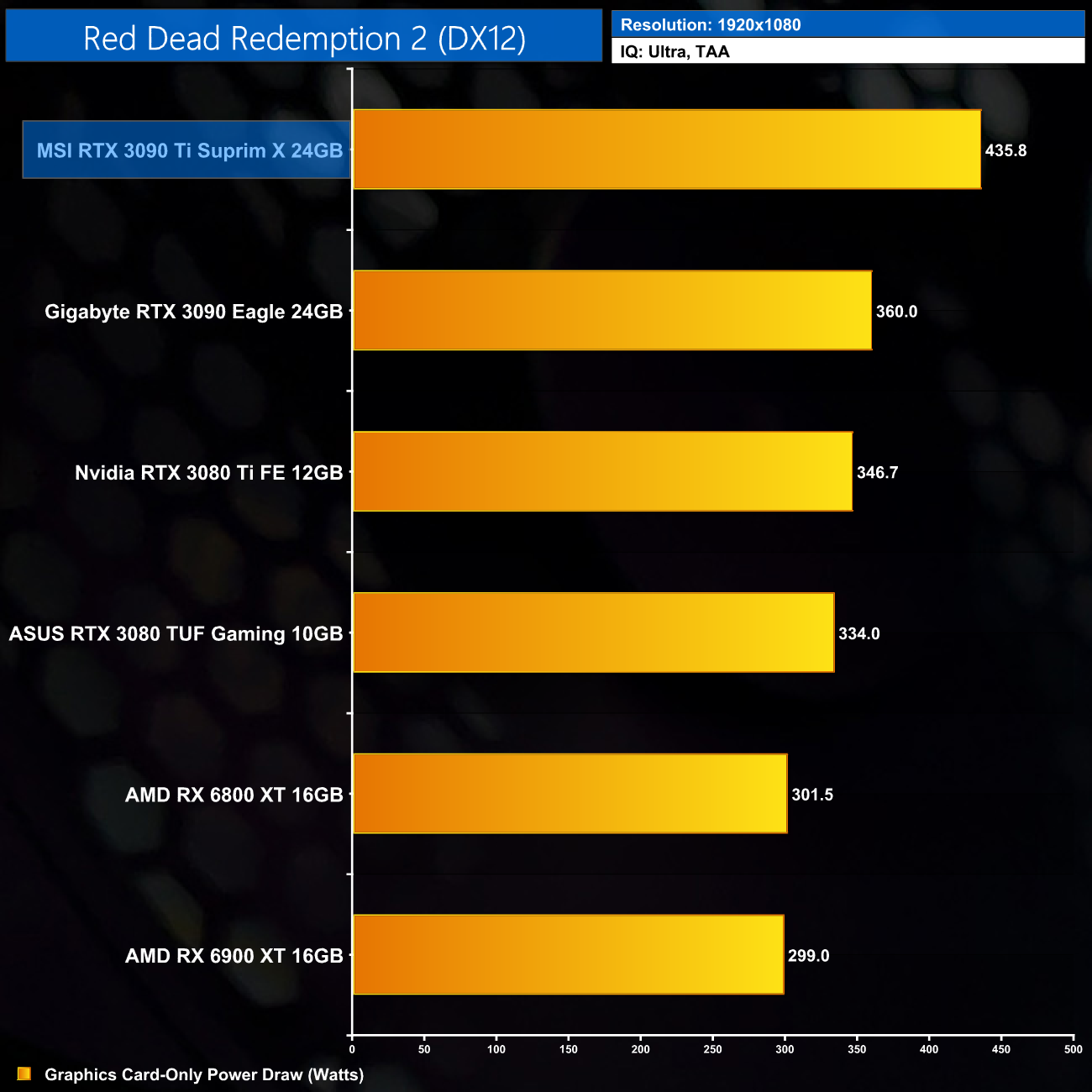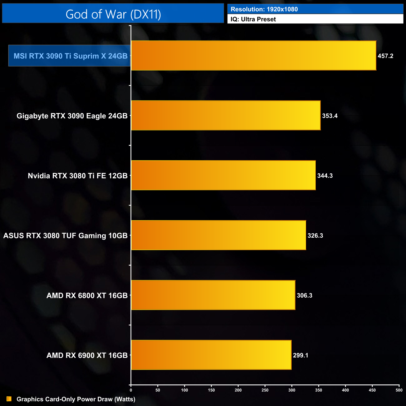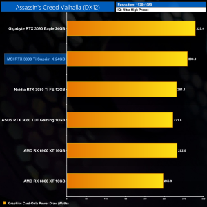 Despite the Suprim X's 480W power target, average power draw is lower at 1080p, where the GPU isn't always fully utilised – we saw an average figure of 394W, a 40W increase over the RTX 3090.