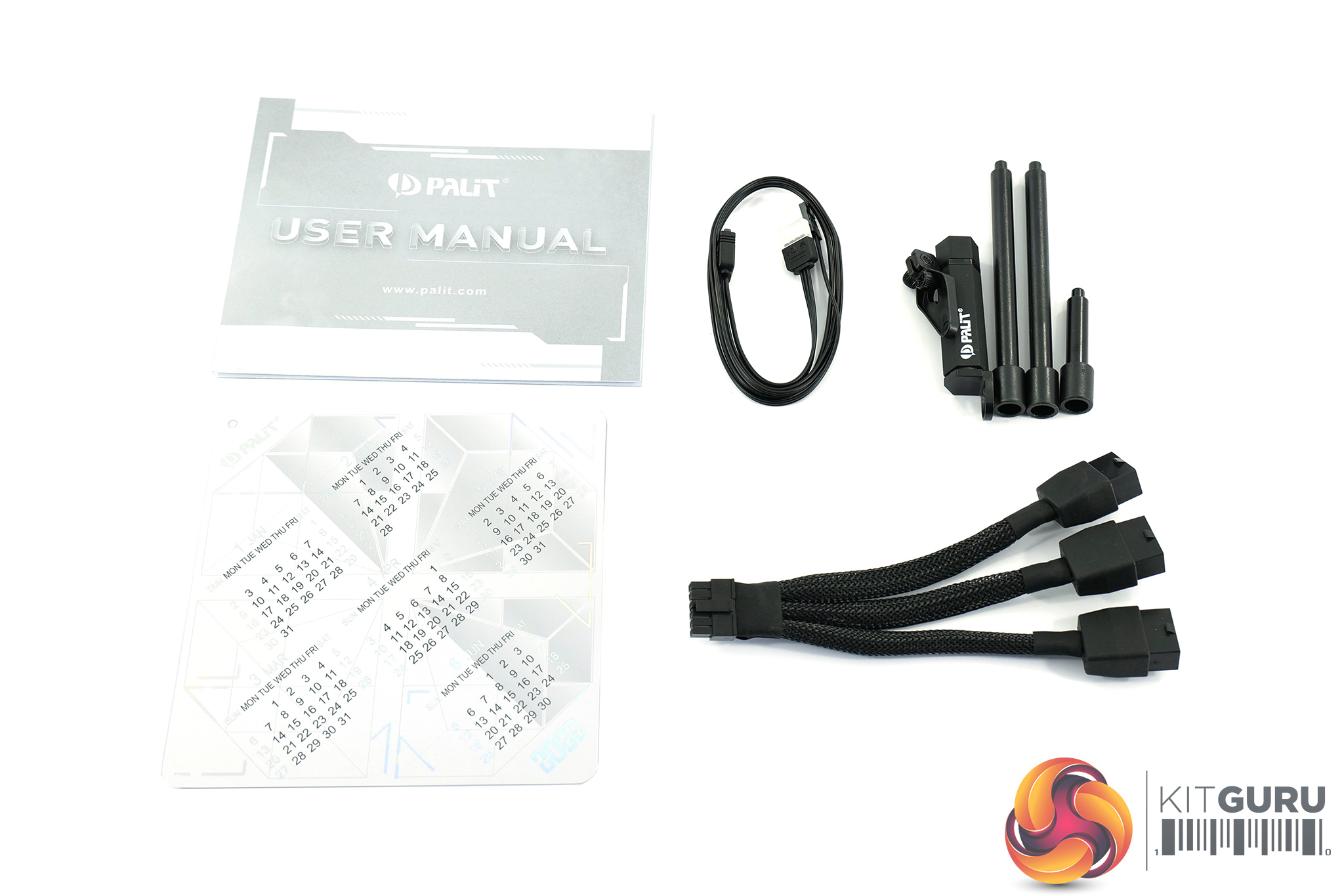 As for the accessories, Palit includes a quick start guide and, oddly, a calendar, along with a support bracket (that just needs assembling) and an RGB extension cable. We also find another power adaptor for the PCIe Gen5 plug.