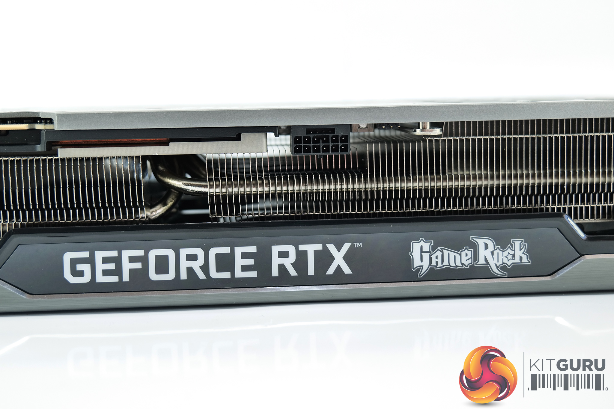 The GeForce RTX and GameRock logos are visible on the top side of the card, and also on the full-length metal backplate, which features several large cutouts at the far end. Palit also includes a dual-BIOS switch right next to the I/O bracket, with a choice between the P (performance) and S (silent) BIOS. The former has a 460W power target, while the latter has a 450W target.