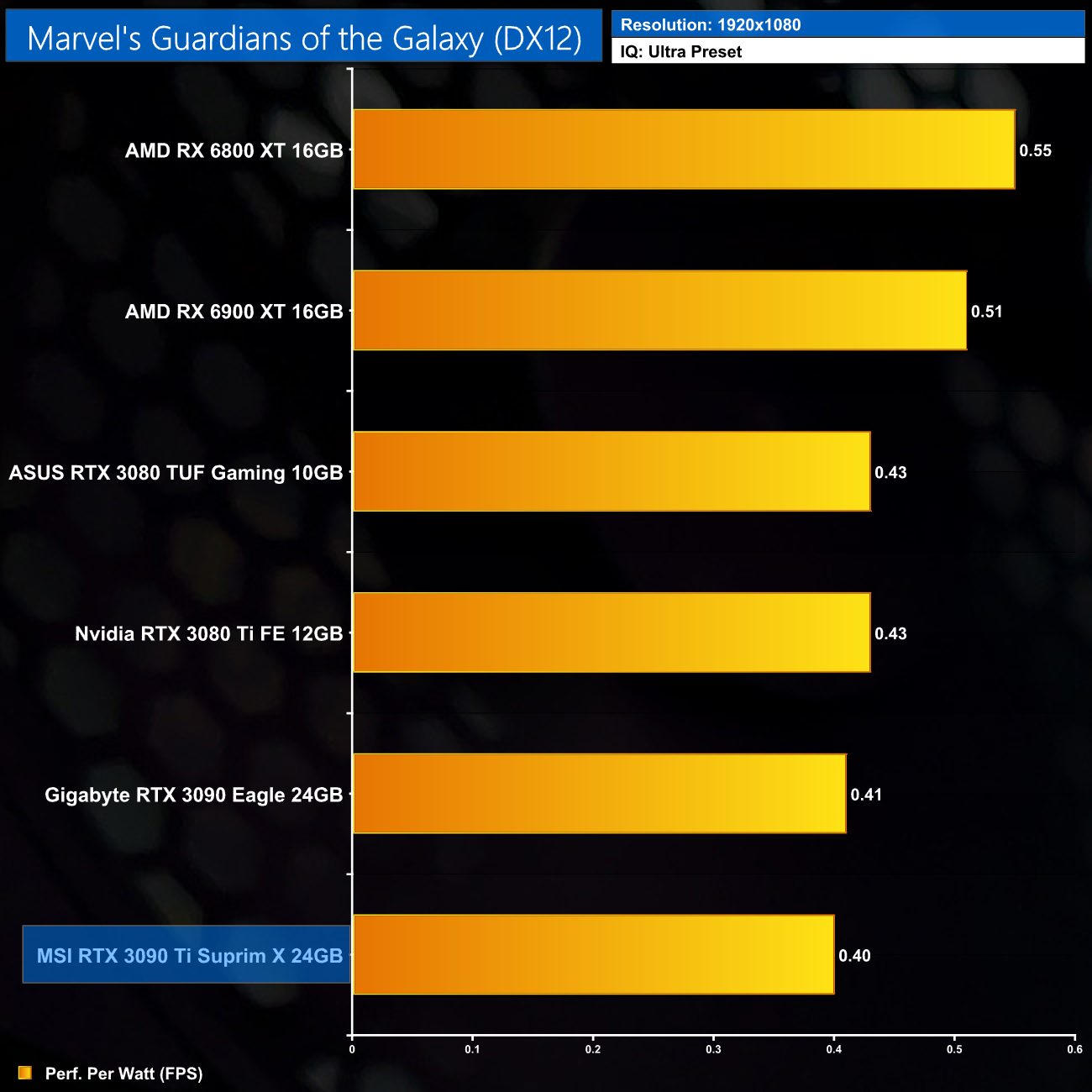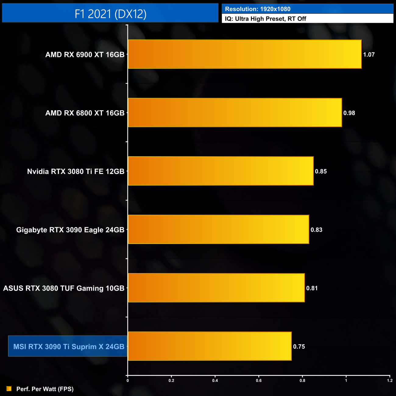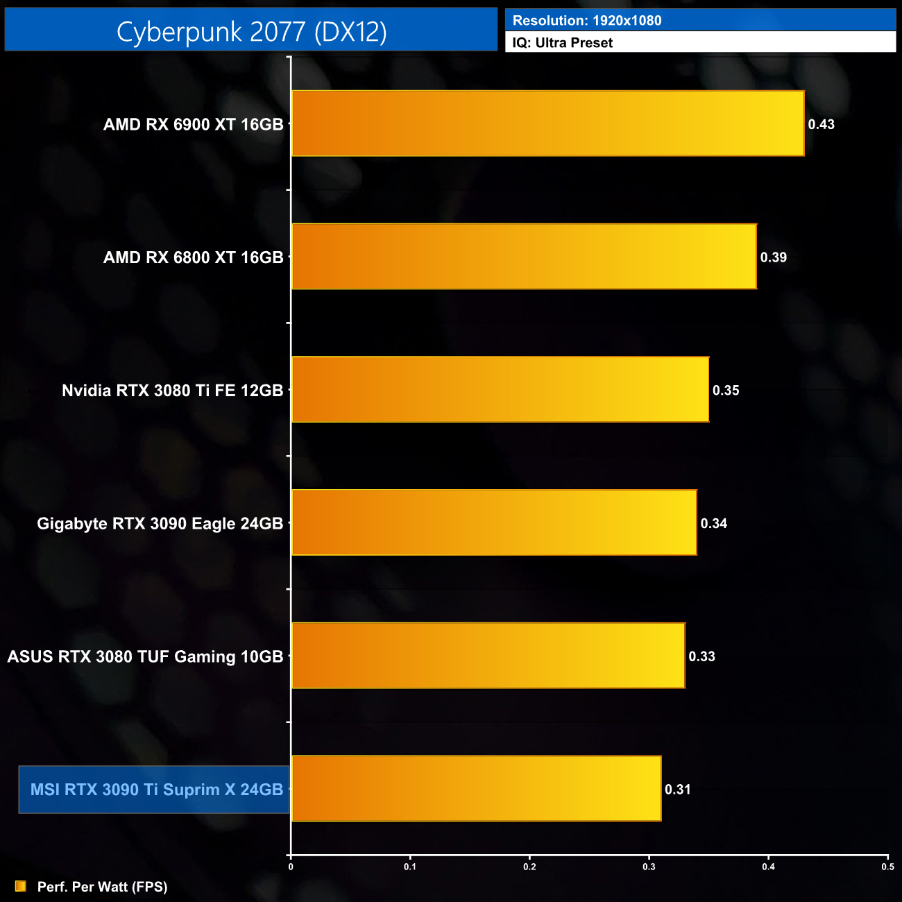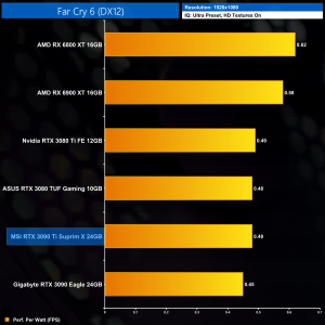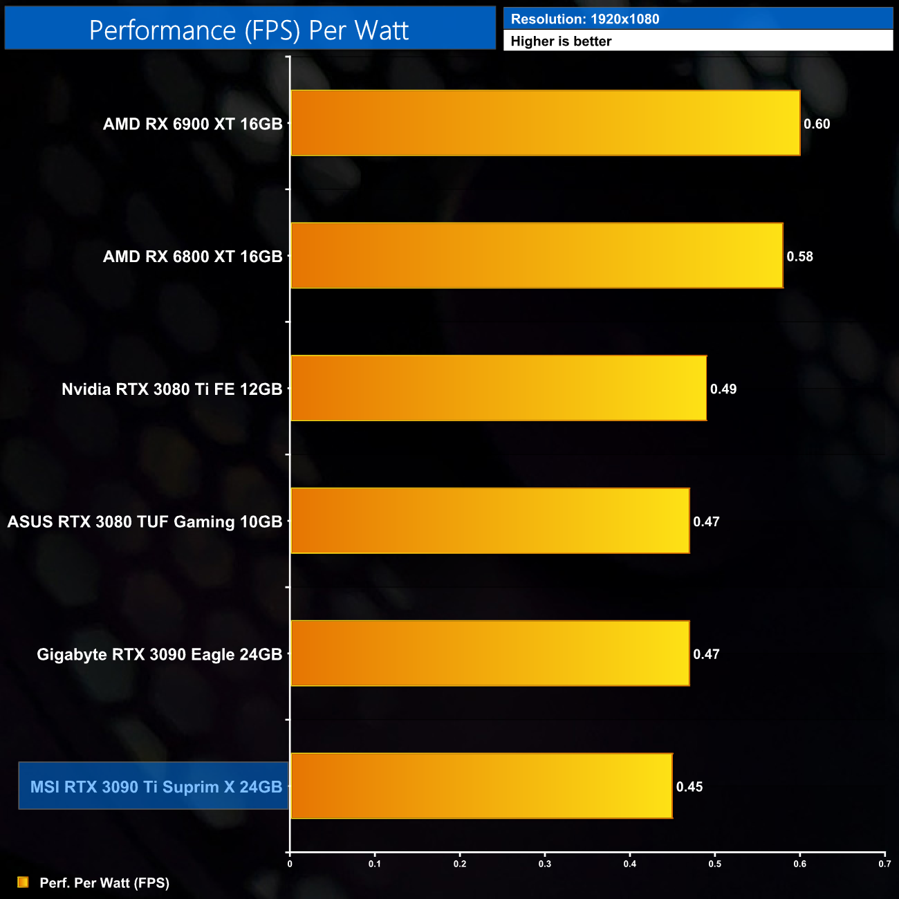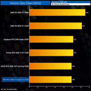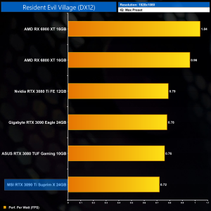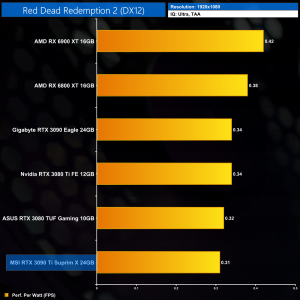 Considering the large increase to power, despite performance gains of 12% on average over the RTX 3090, it's no surprise to see the RTX 3090 Ti rock bottom of our performance per Watt chart, even at 1080p where its power draw was lowest.