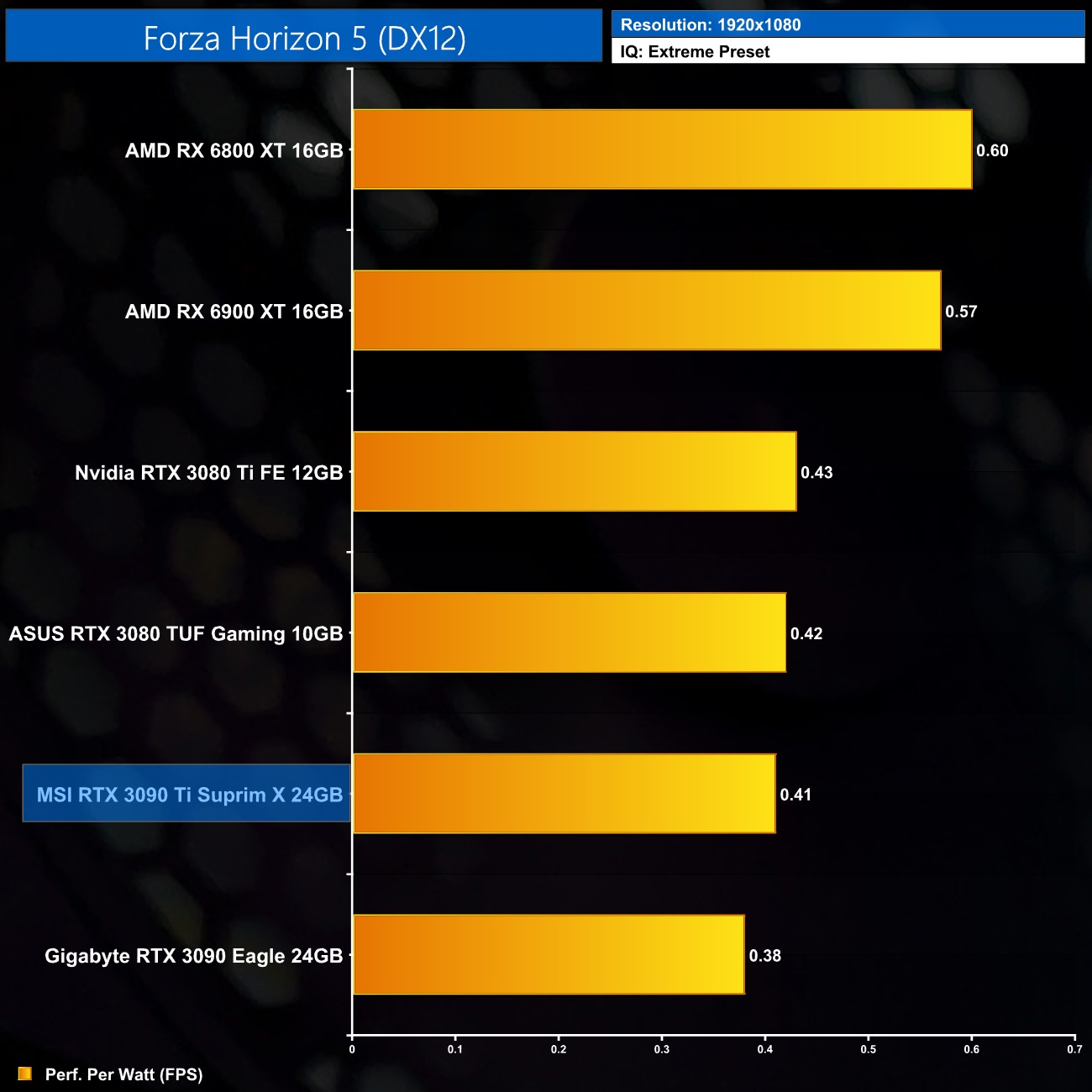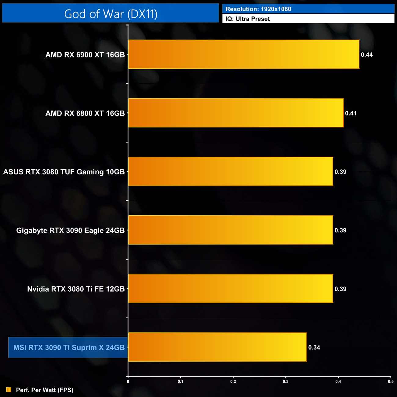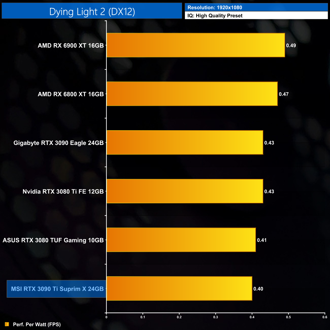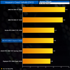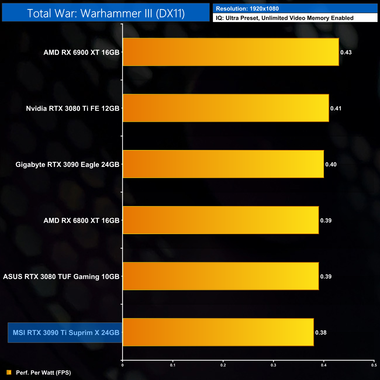 Considering the large increase to power, despite performance gains of 12% on average over the RTX 3090, it's no surprise to see the RTX 3090 Ti rock bottom of our performance per Watt chart, even at 1080p where its power draw was lowest.