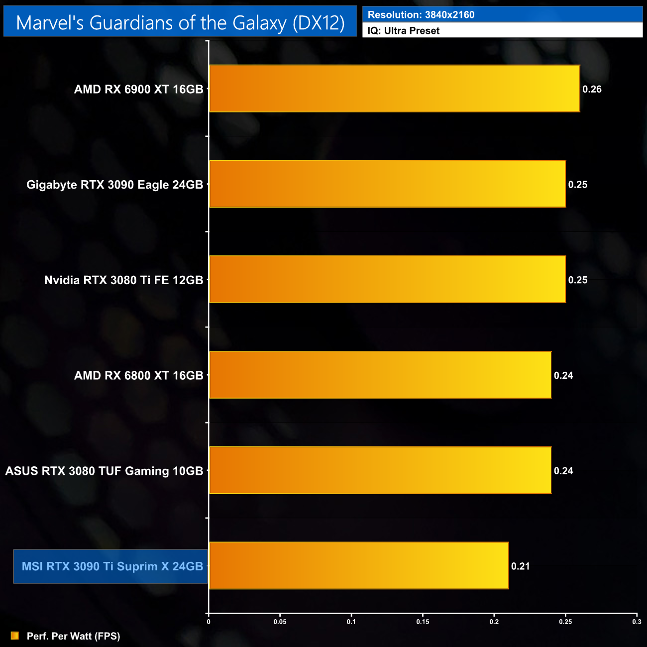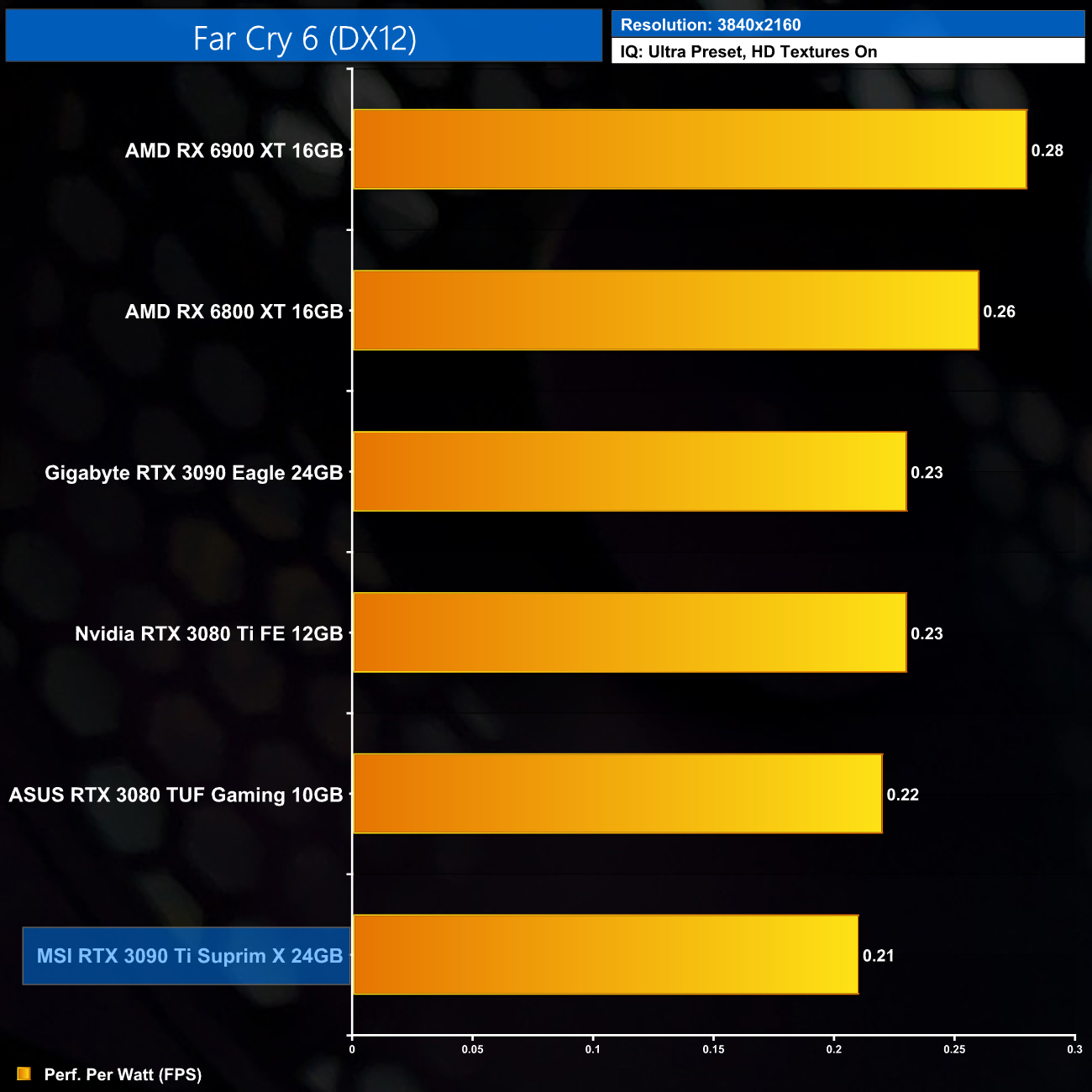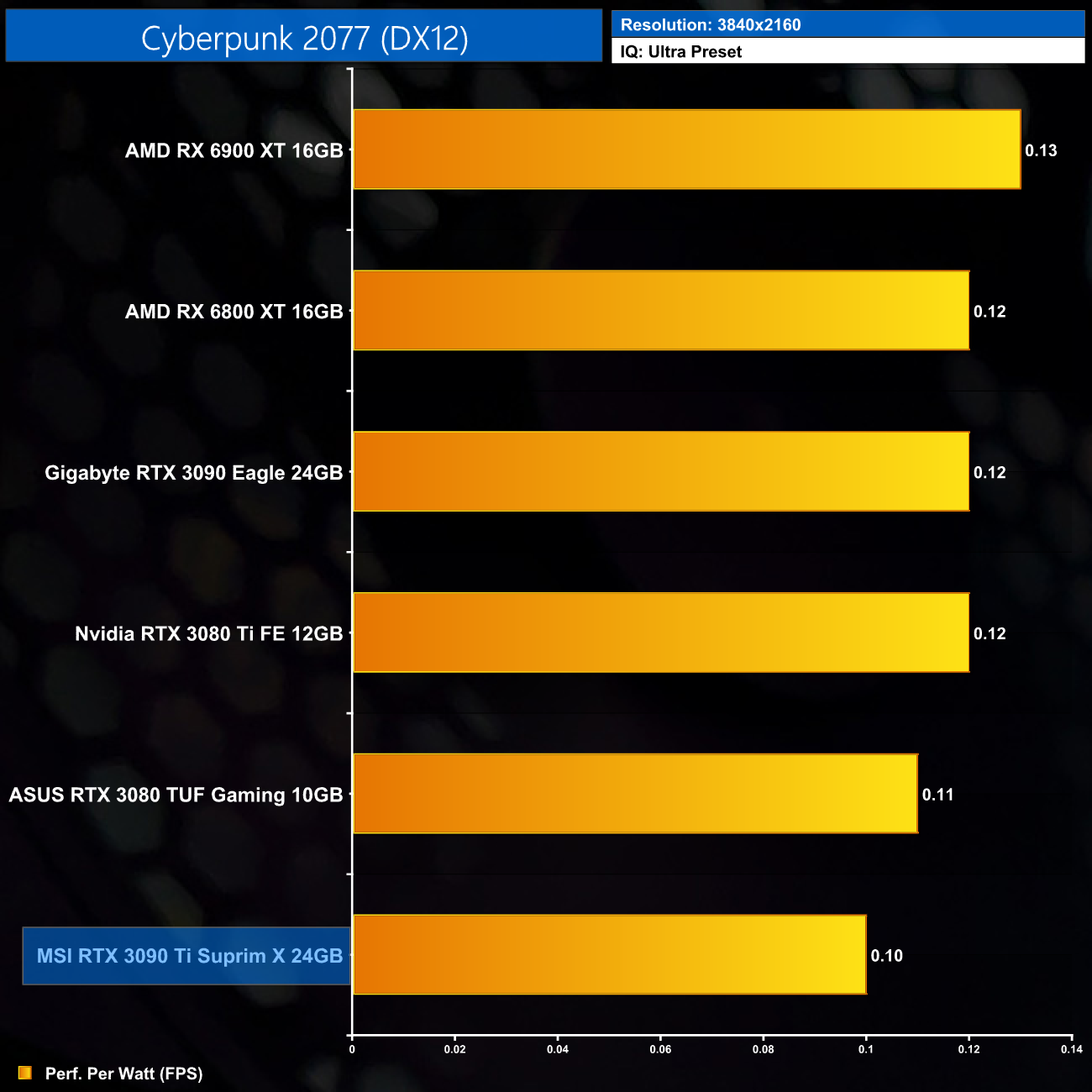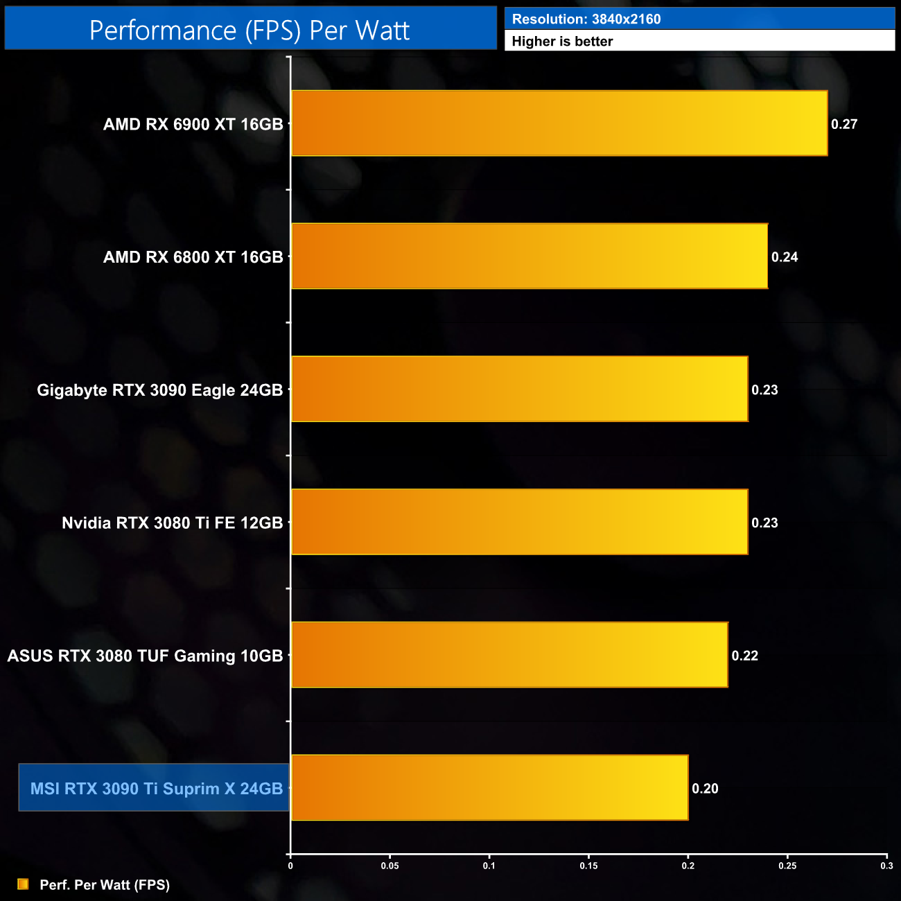 At 4K, the RTX 3090 Ti is once again rooted to the bottom of our chart for performance per Watt. It's 9% behind the RTX 3080 and 26% behind the RX 6900 XT.