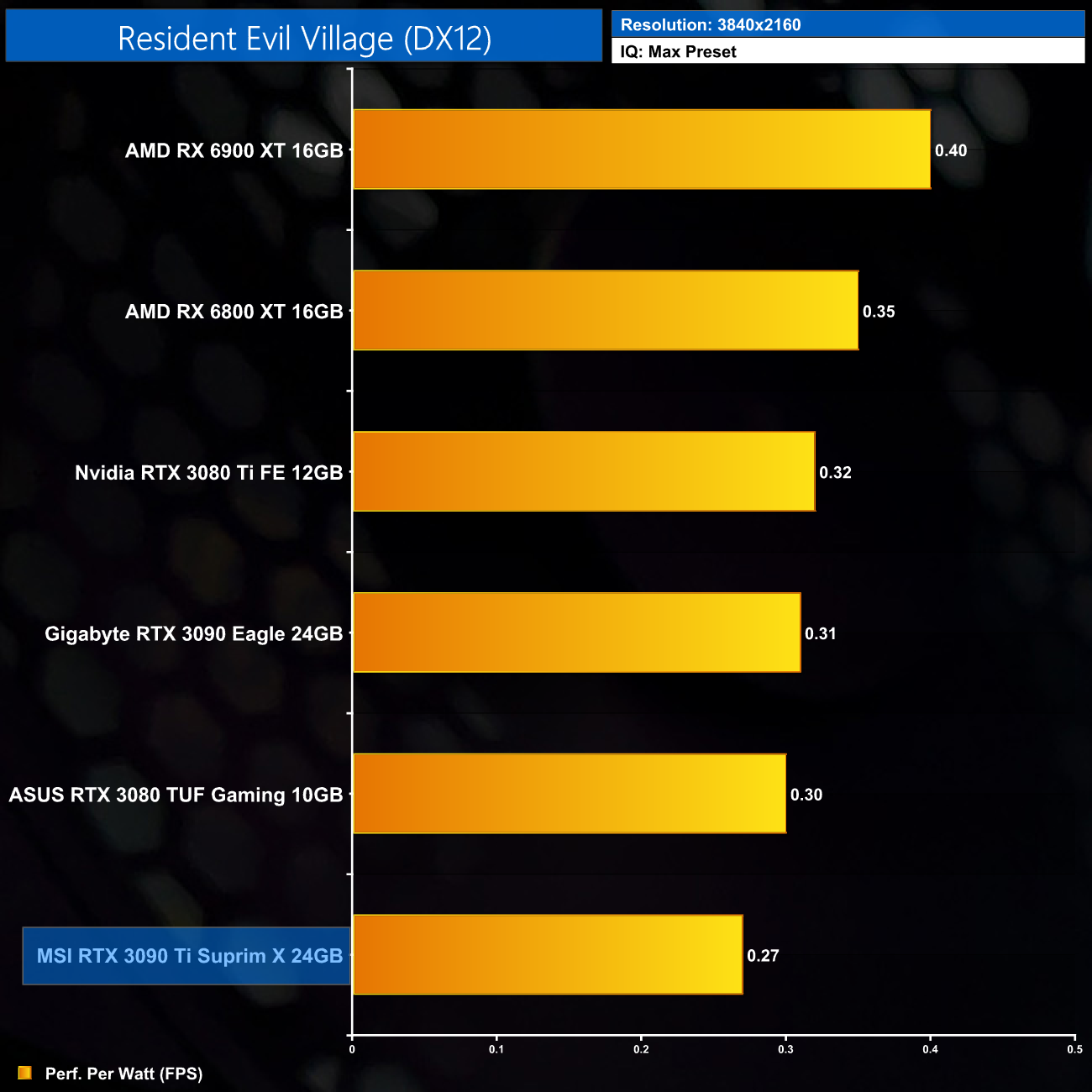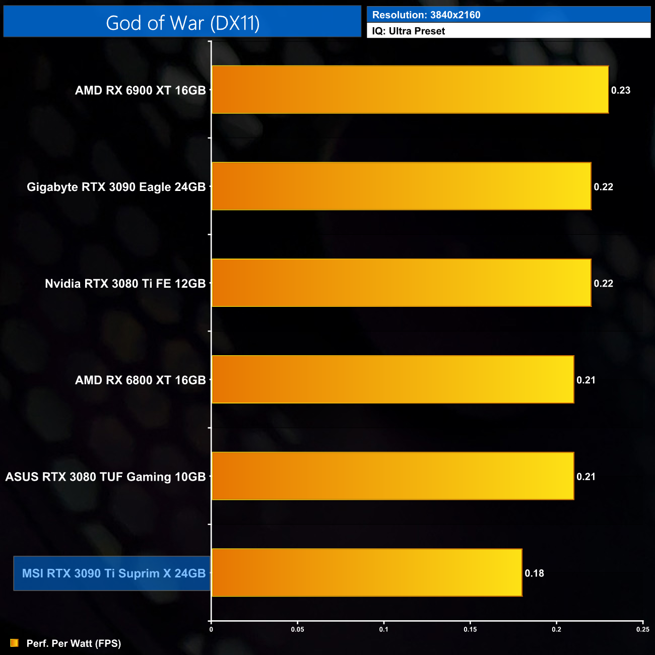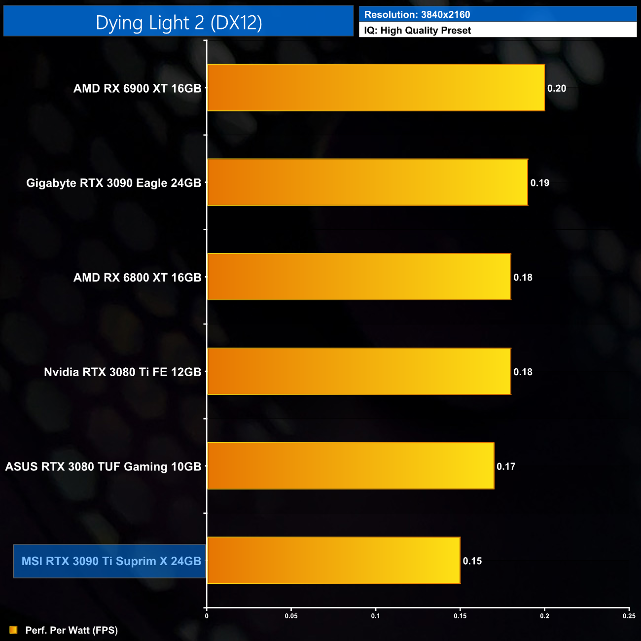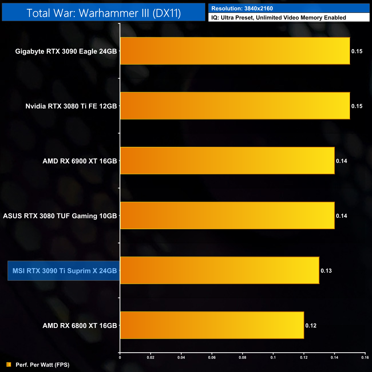 At 4K, the RTX 3090 Ti is once again rooted to the bottom of our chart for performance per Watt. It's 9% behind the RTX 3080 and 26% behind the RX 6900 XT.