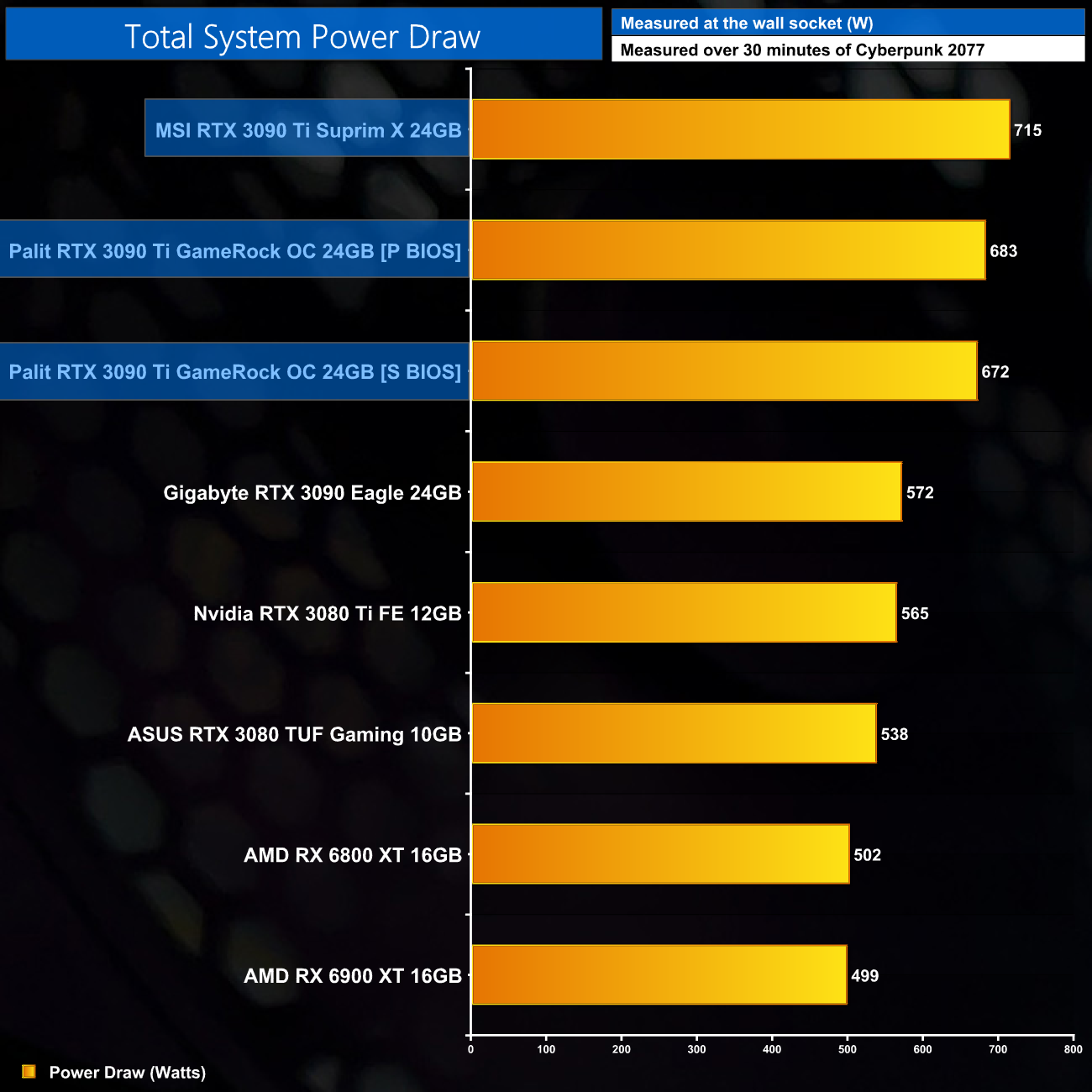If you're wondering about total system power draw, with our i9-12900K test PC, power draw exceeded 710W when using the MSI Suprim X. The GameRock OC does have a slightly lower power target, but even then 680W is a lot of power for a single-card system.