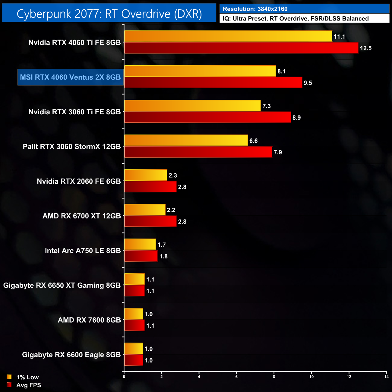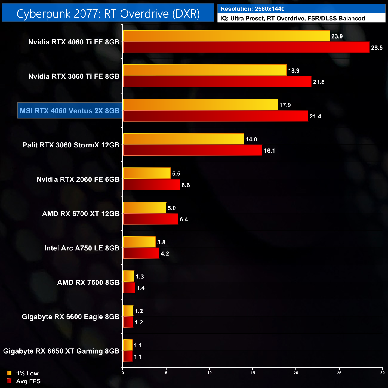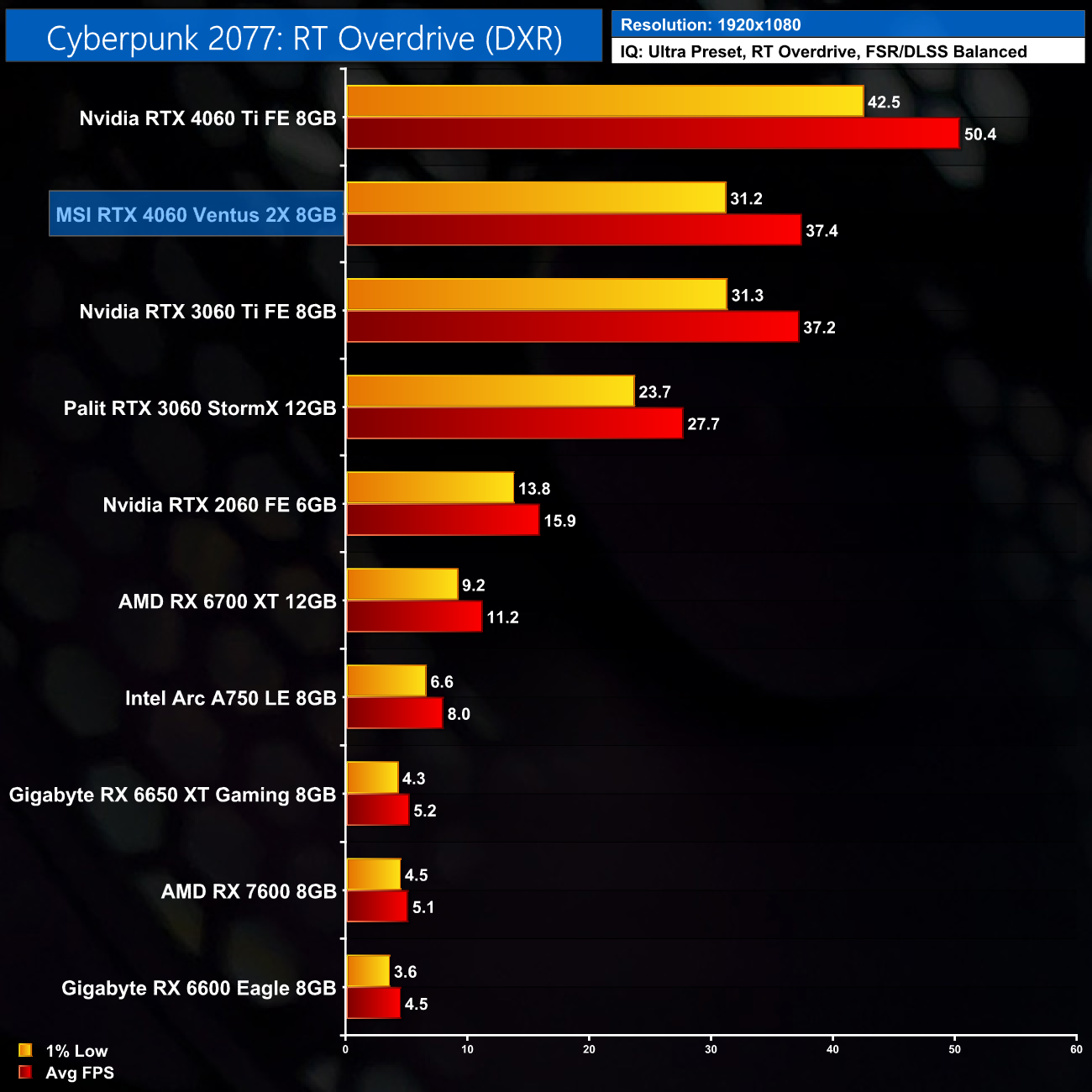How about the new RT Overdrive mode though? This time we are testing with upscaling set to balanced mode on all GPUs, as otherwise the data would just be completely useless. Even then, at 1080p it's still a struggle for the RTX 4060, but it is able to keep the 1% lows above 30FPS. We can also get an idea of how much faster Nvidia GPUs are compared to their AMD counterparts for this test – not even the RX 6700 XT can manage double-digit 1% lows.