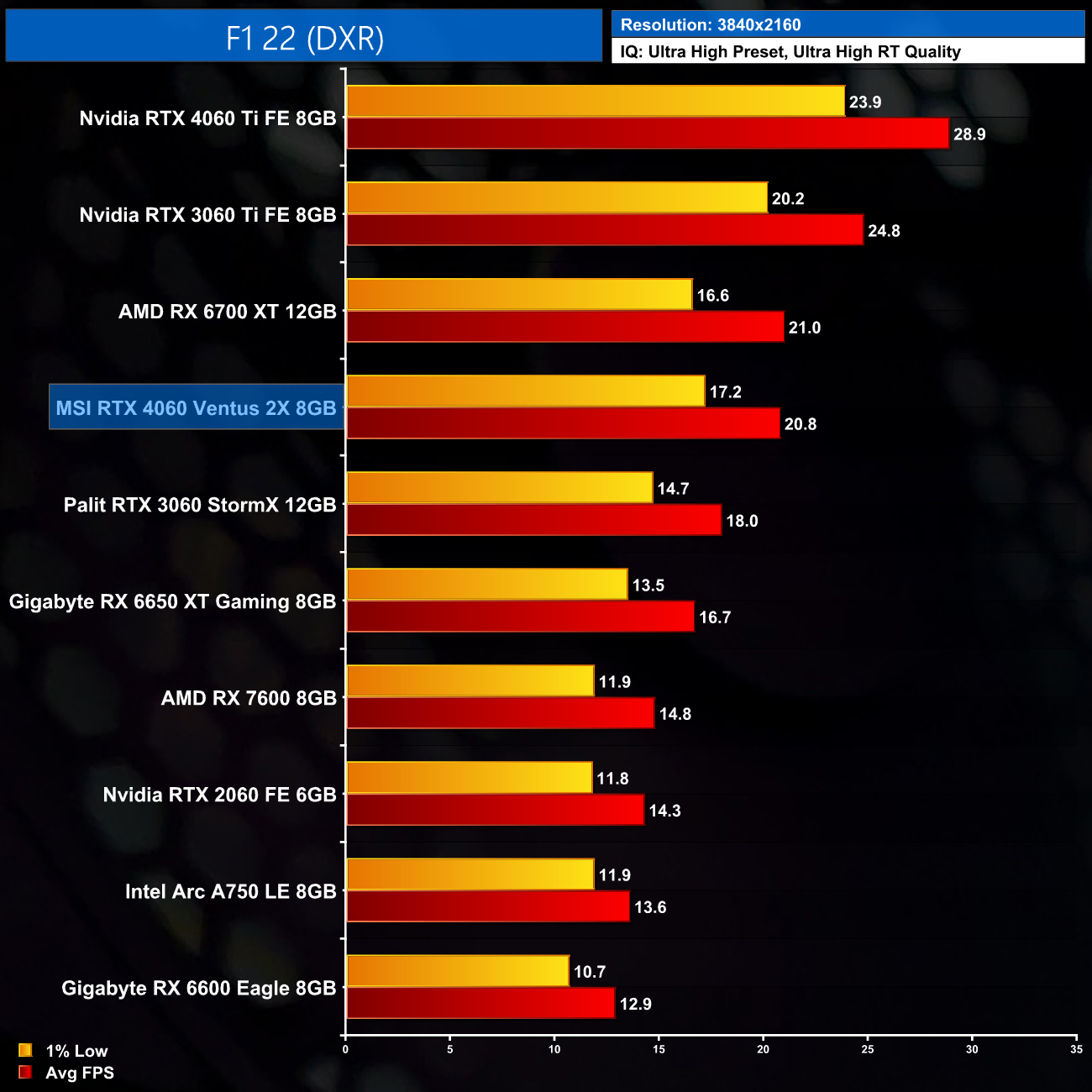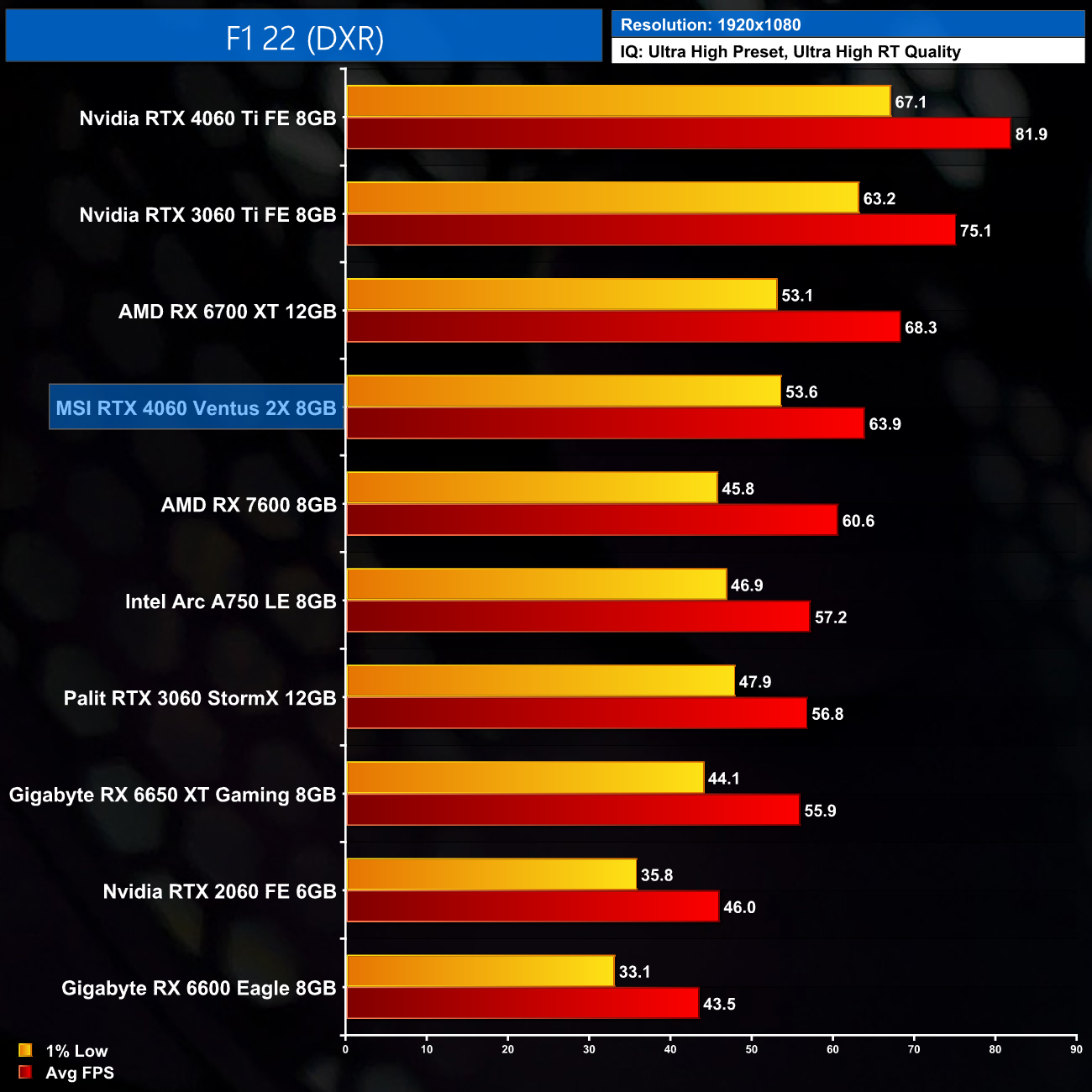 F1 22 is much less demanding overall, despite featuring a number of ray traced effects. At 1080p the RTX 4060 is able to deliver over 60FPS on average, making it just 5% faster than the RX 7600. The RX 6700 XT is also slightly faster here, a rarity in ray traced games.