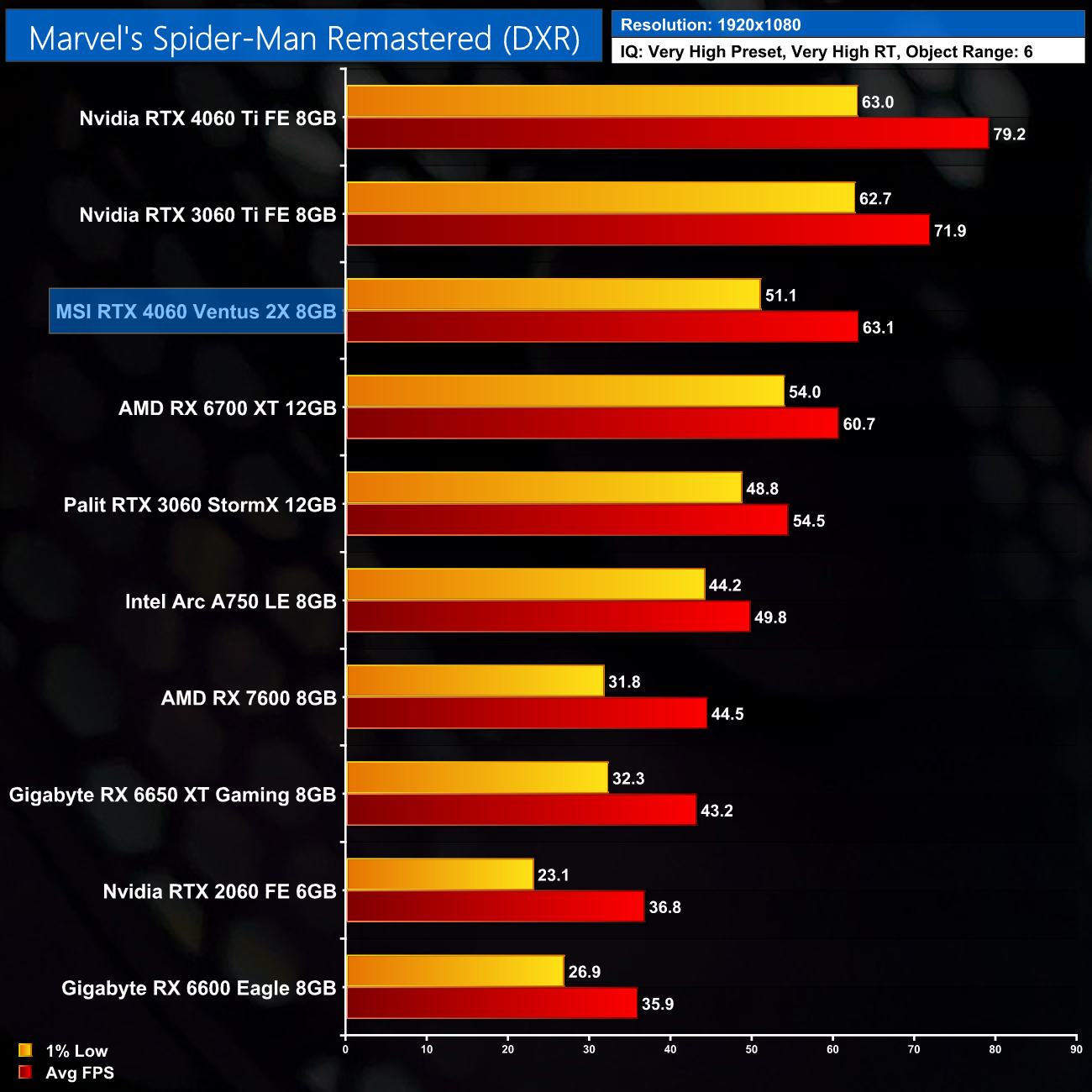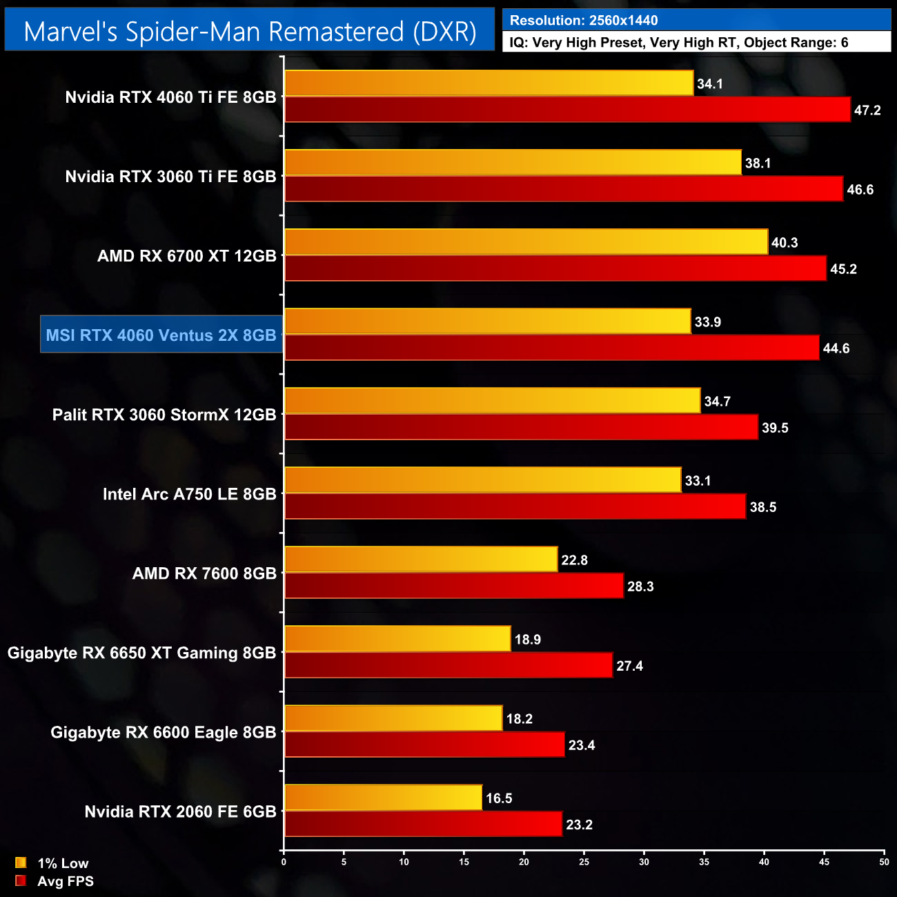 Spider-Man Remastered is next, and with just ray traced reflections, it's not too punishing. The RTX 4060 is able to average 63FPS, and it's 42% faster than the RX 7600. That said, the 1% lows aren't quite as tight as what we see from the likes of the RX 6700 XT – that GPU has a lower average frame rate but higher 1% lows, so it's likely we're looking at the start of a VRAM limitation here. A quick look at the 1440p data also suggests the same – the gap between the 1% lows and average frame rate is much wider than even the RTX 3060.