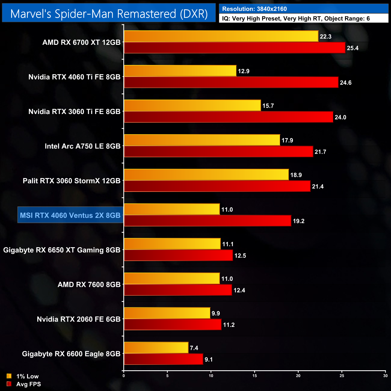 Engine: Insomniac Games in-house engine. We test using the Very High preset, Very High RT, RT Object Range: 6. DXR API. DLSS/FSR are disabled.