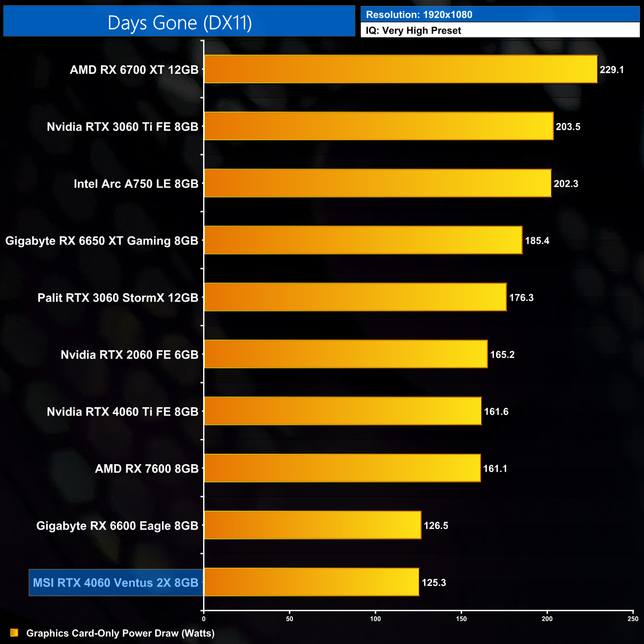 The RTX 4060 is slightly unusual among the 40-series GPUs, as our testing showed it actually exceeded the 115W TGP. Not in every game, but the likes of Cyberpunk 2077 and Days Gone see power draw hitting 125W. Over all 12 games we tested it averaged 119.7W, so only slightly above TGP, but considering all the other 40-series cards come in under the rated TGP, it's interesting behaviour. It definitely looks like the 4060 is much more power limited than its more powerful siblings. Of course, power is still very low, coming in about 40W below the RX 7600.