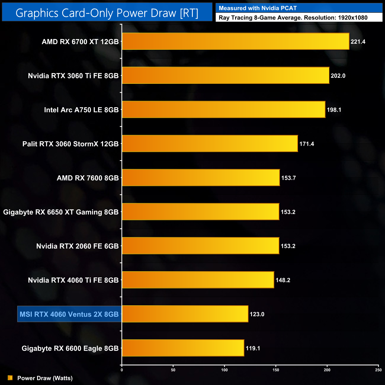 Power draw with ray tracing is a touch higher still, this time averaging 123W over the 8 RT games we tested.
