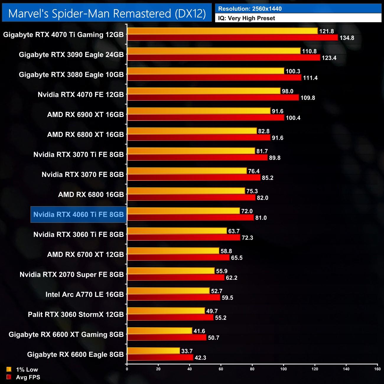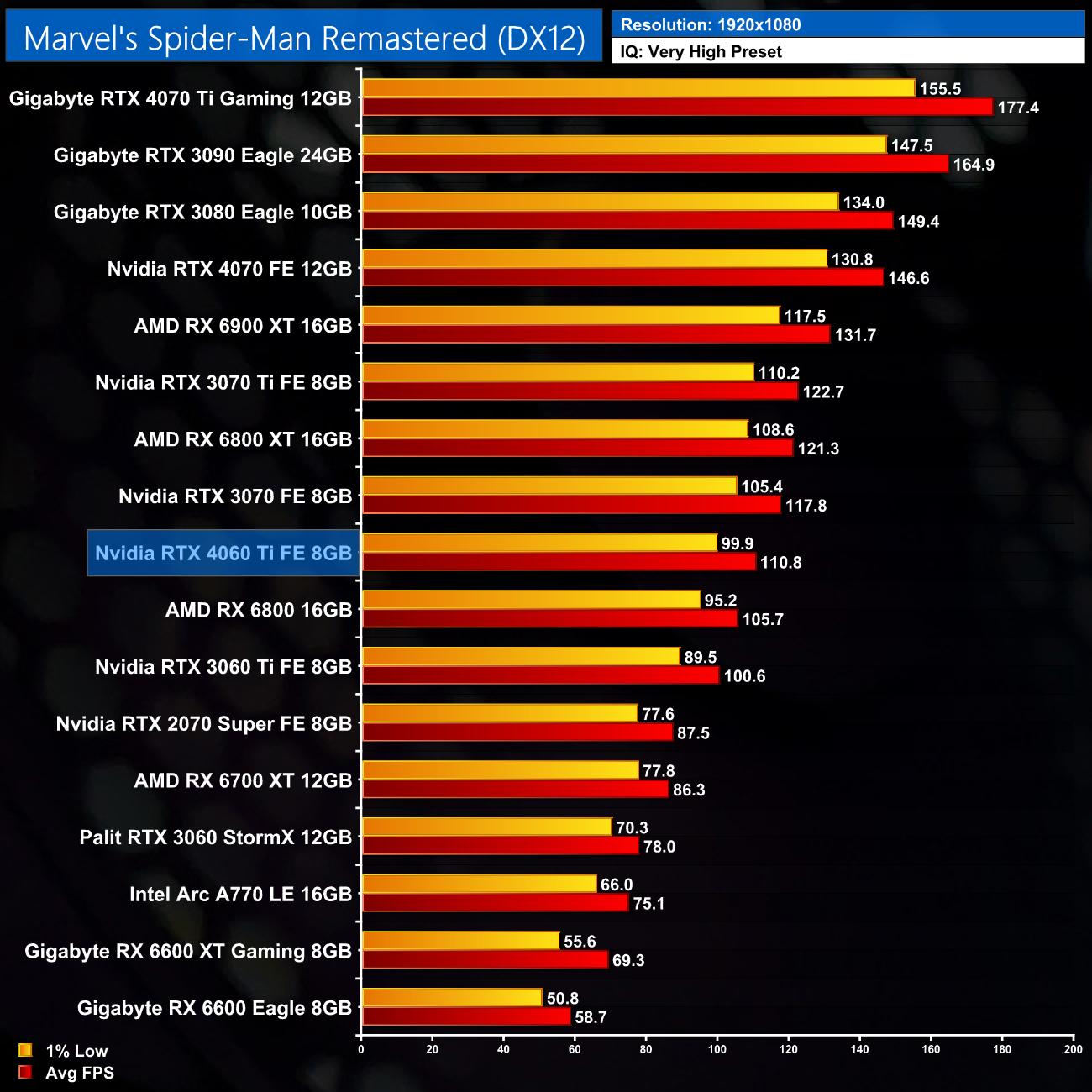 Things are slightly better in Spider-Man Remastered, with the 4060 Ti delivering 111FPS, making it 10% faster than the RTX 3060 Ti. AMD GPUs struggle in this game, and the 4060 Ti pulls out a 28% lead over the RX 6700 XT, and it's even a touch ahead of the RX 6800. It's just a shame it's not faster than the 6800 in more titles.