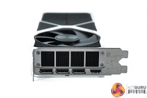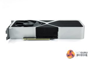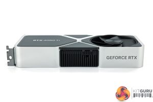 The side of the card is fairly plain, with the new silver metal frame on show, along with some aluminium heatsink fins. The GeForce RTX branding is also present here towards the end of the card.