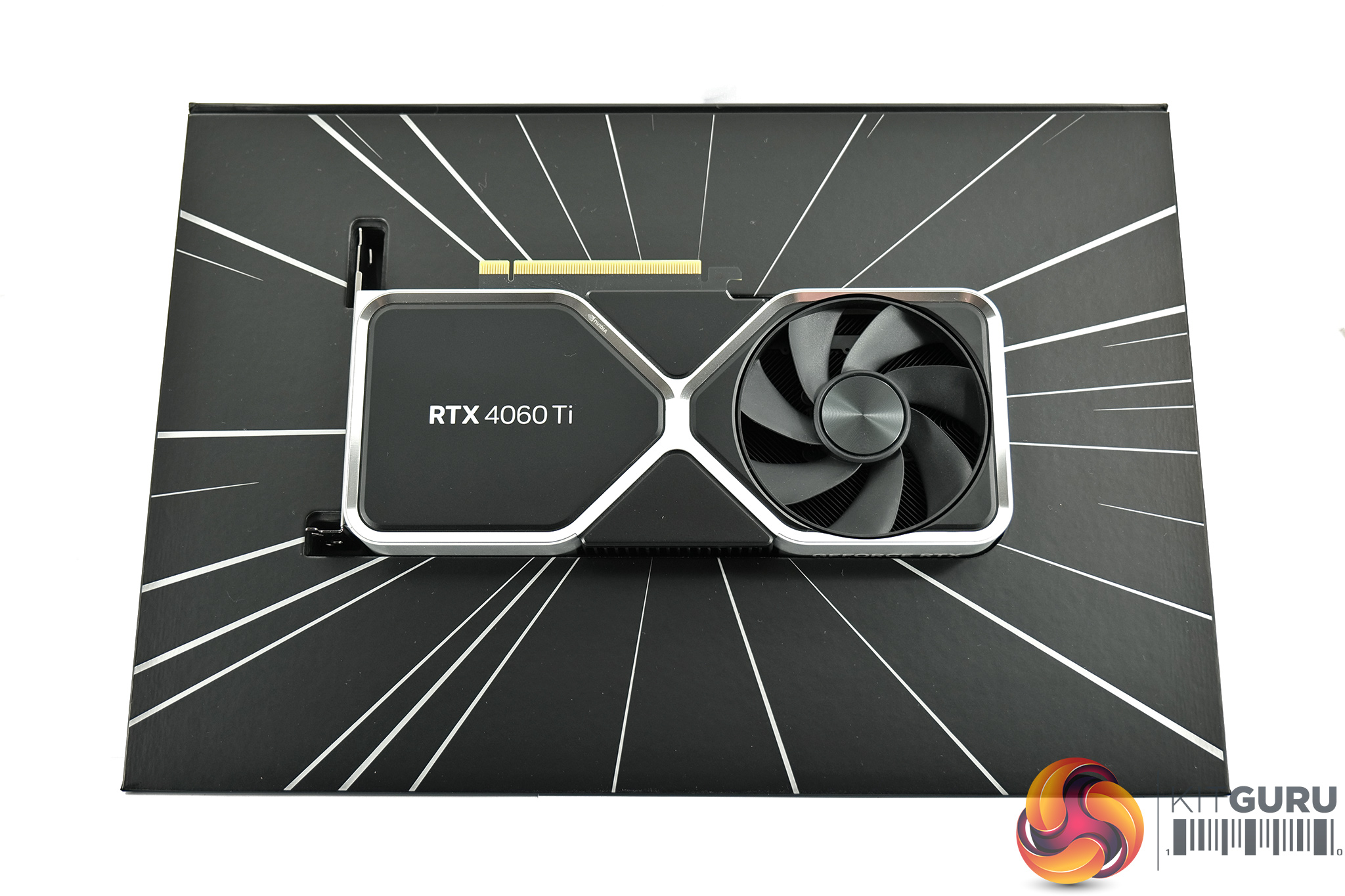 The Nvidia RTX 4060 Ti ships in the same box as the rest of the 40-series Founders Edition models. The box opens up to reveal the card sitting in the middle of the cardboard surround.